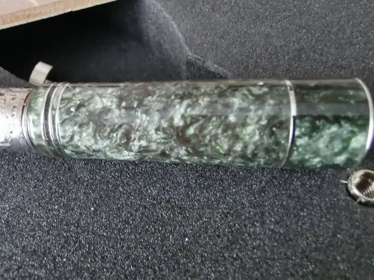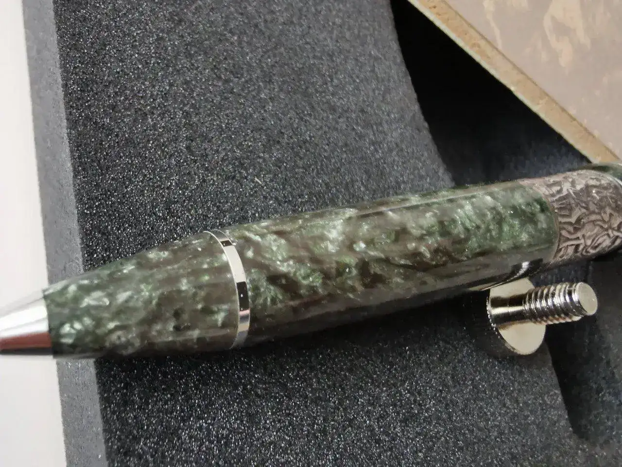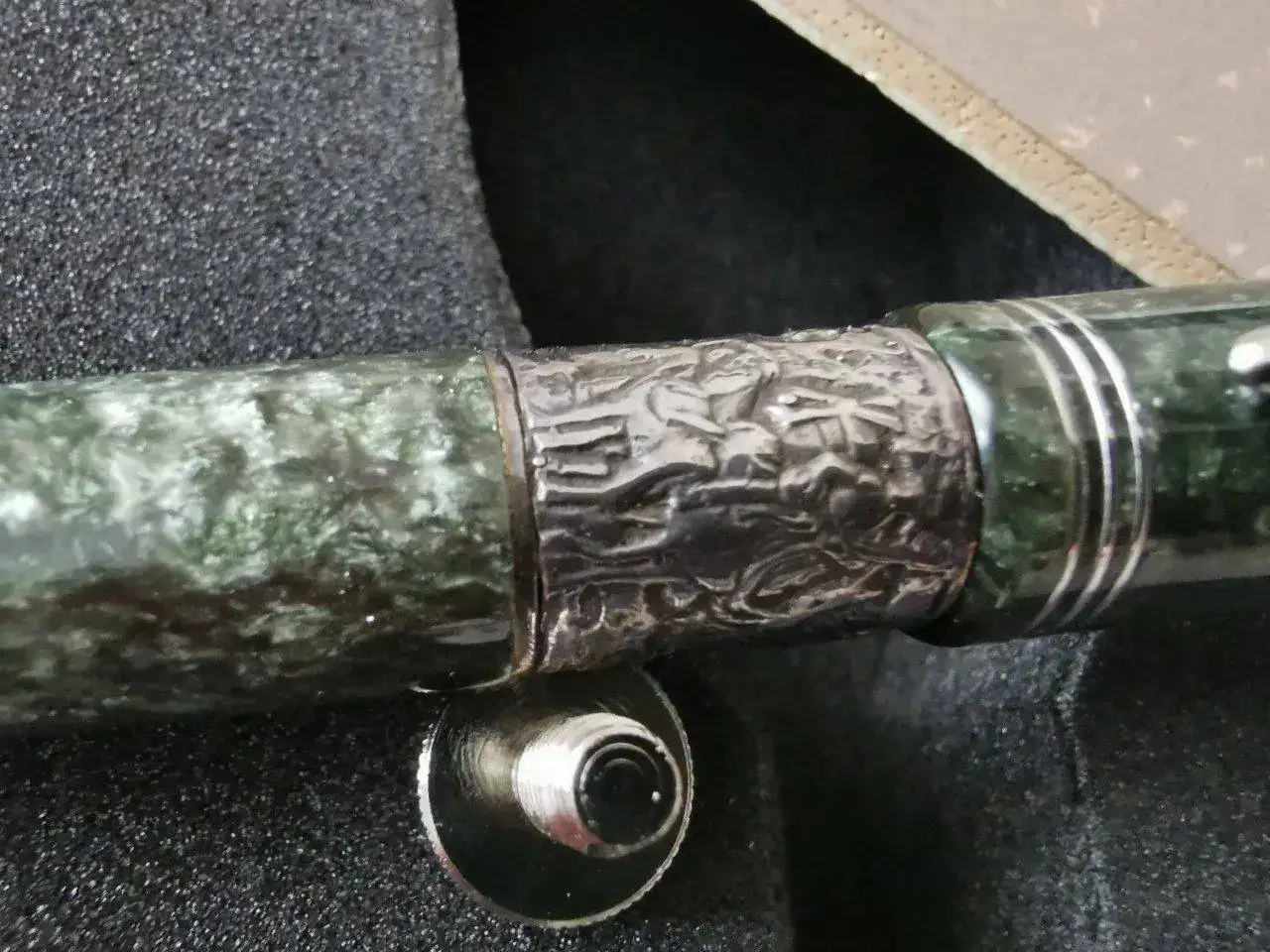 Cuerpo: Resina especial torneada a mano a barra llena. Acabado madreperla que recuerda al jade. Franja de plata maciza en la que se recrea el episodio de los molinos.