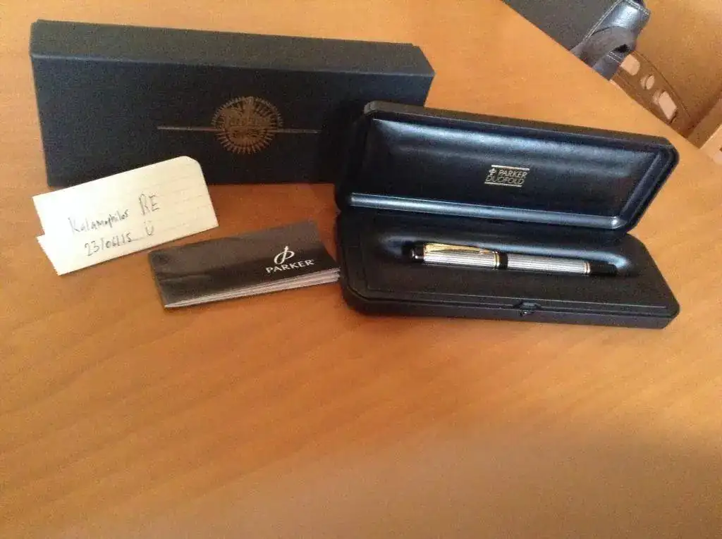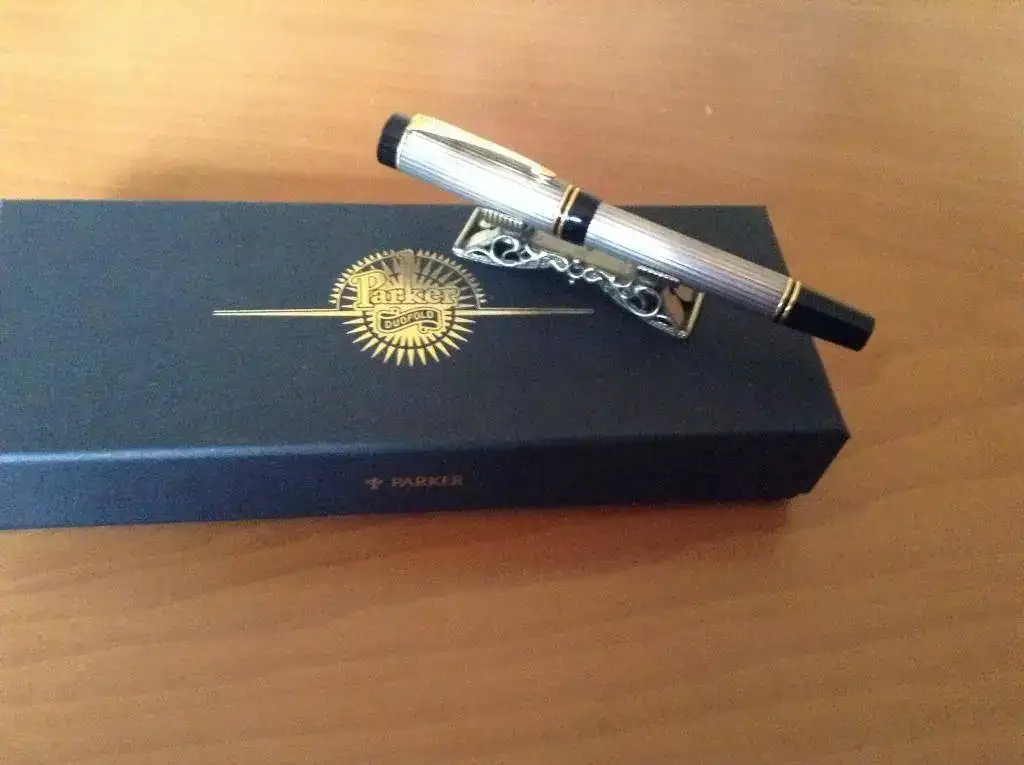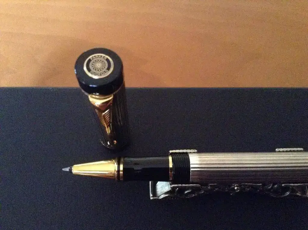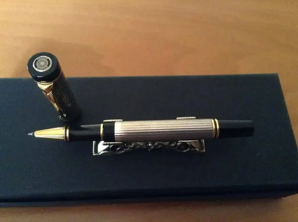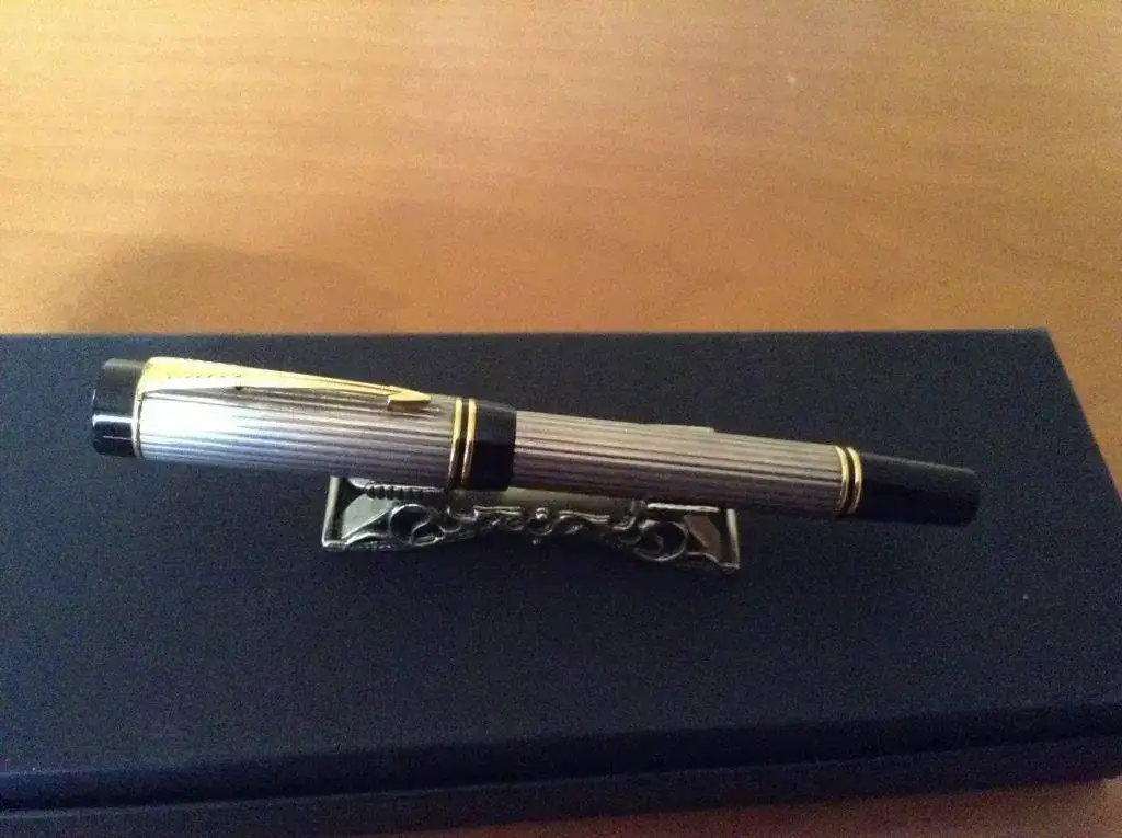 ¿Vas a usar roller? Pues que sea uno con estilo y solera, pensé. Y me compré este roller Parker Duofold de plata 925. Es del tamaño de una Duofold International, el único tamaño que hay en roller. Tiene los acabados de las Duofold de serie limitada, con el sello de círculos en la cima del capuchón. Usa recambios de roller Parker normales, de los que se encuentran en cualquier papelería. Ahora mismo tiene puesto uno negro de punto fino. Para el envío se lo quitaría y lo pondría en el mismo paquete, envuelto aparte para evitar accidentes.