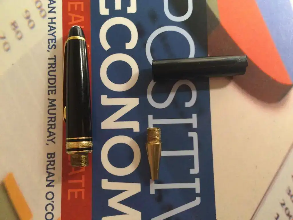 Muy Buenas Noches compañeros me estreno en el foro de grafos y mi problema es que tengo de un bolígrafo Montblanc Meisterstuck y no se si es auténtico. El bolígrafo era de mi padre y se lo dio un comercial de Montblanc hace unos cuantos años, el boligrafo ha servido bien siempre hasta que se le calló y se rompió parte del cuerpo del bolígrafo. No dispone de numero de serie, cosa un poco extraña, pero he leído que la mayoría antes de 1991 no disponían de ellos. La única inscripción es W-GERMANY. Y antes de repararlo me gustaría saber si llevarlo al servicio técnico o no. Gracias (Lo oscuro que se ve en la rosca de la punta es pegamento, en ningun momento ha perdido color)