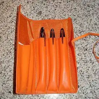 Este tipo de diseño, es conocido como "roll" o "rollo". Se trata de un estuche de cuero o tela, que contiene una serie de bolsillos internos, que pueden alojar una pluma en cada uno de ellos.