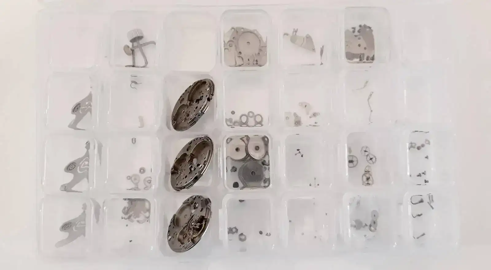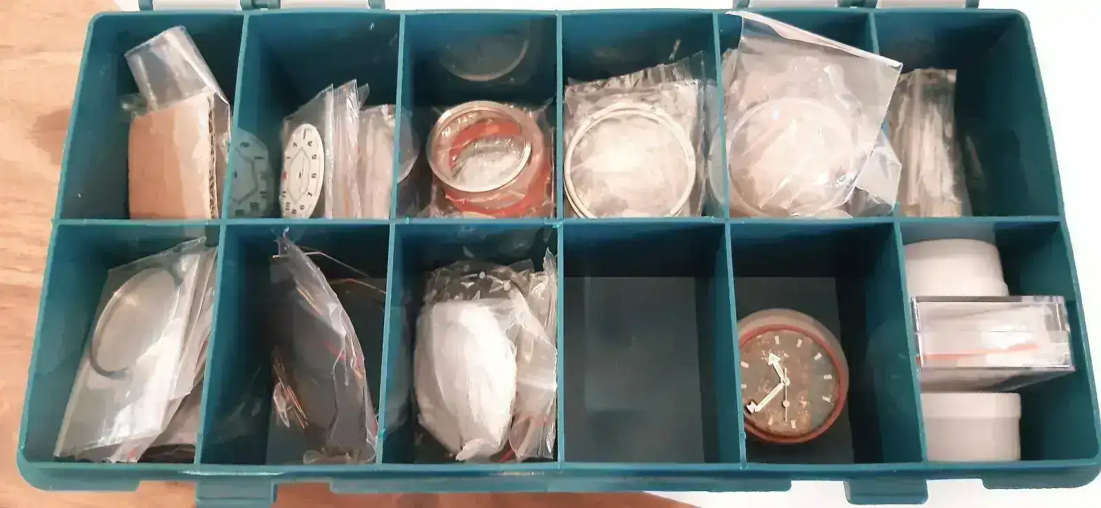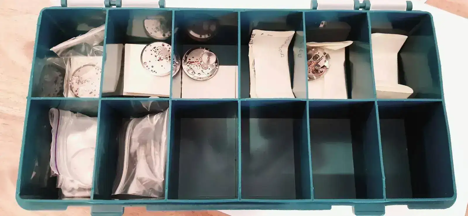 Y en estas cajitas guardo las piezas que voy recuperando. Una para Vostoks manuales, otra para automáticos y otra para Raketas: