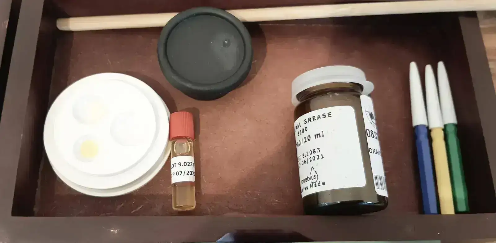 Lavado: ultrasonidos, alcohol, chofa de mechero, pincel, cestillos y botes para no gastar mucho líquido. Además agua y Fairy:
