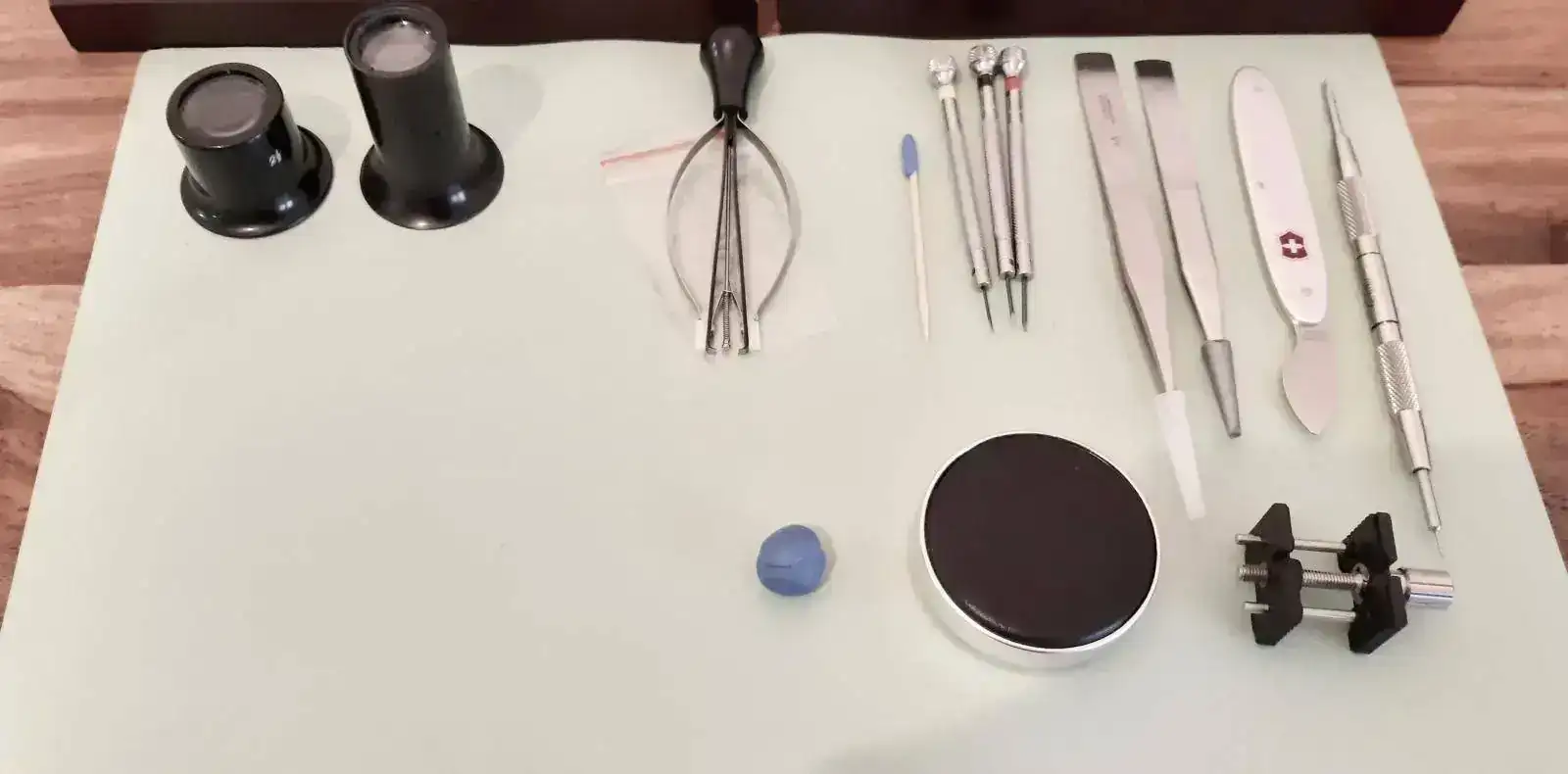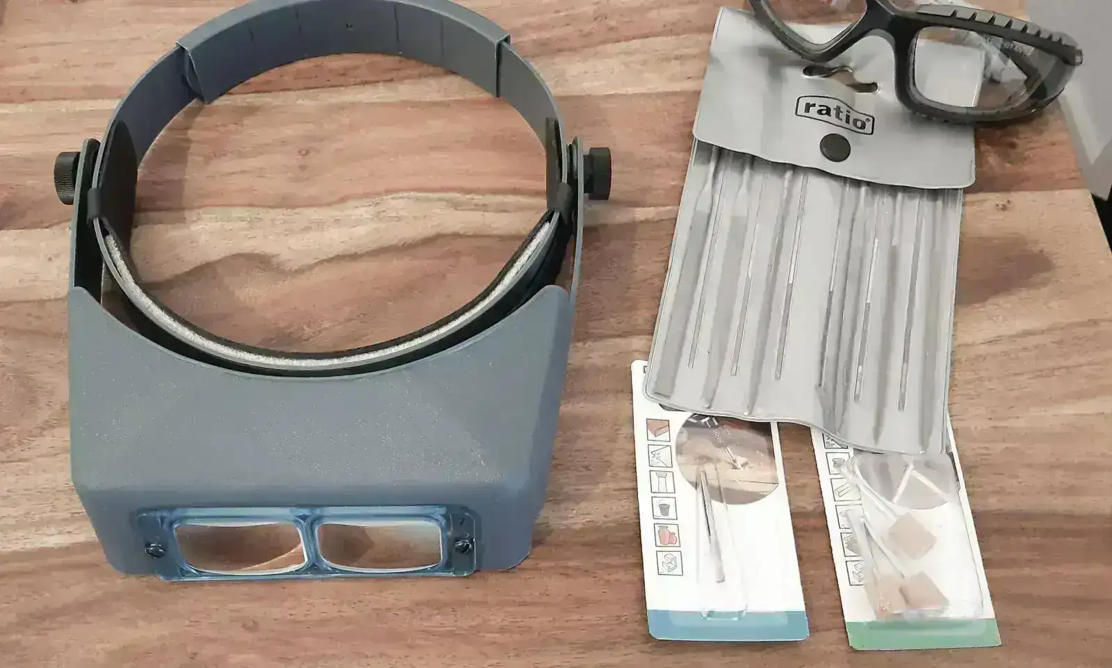 Optivisor que es mi herramienta más preciada y uso para todo y herramienta pesada para destruir cajas. No pongo la dremel pero está ahí: