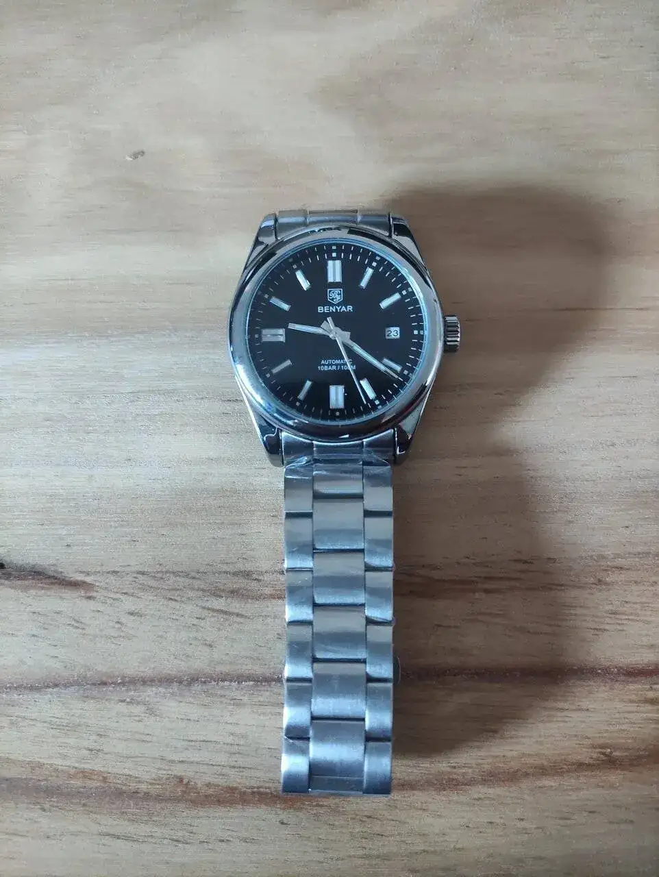 Tengo uno igual en esfera amarilla y de momento va perfecto.Este llegó ayer y es para regalar. Obviamente está lejos de grandes marcas y el diseño es un refrito, aunque no sé si es tal cual alguno de grandes marcas. Fecha a las 3 y bastones dobles en 6-9-12.