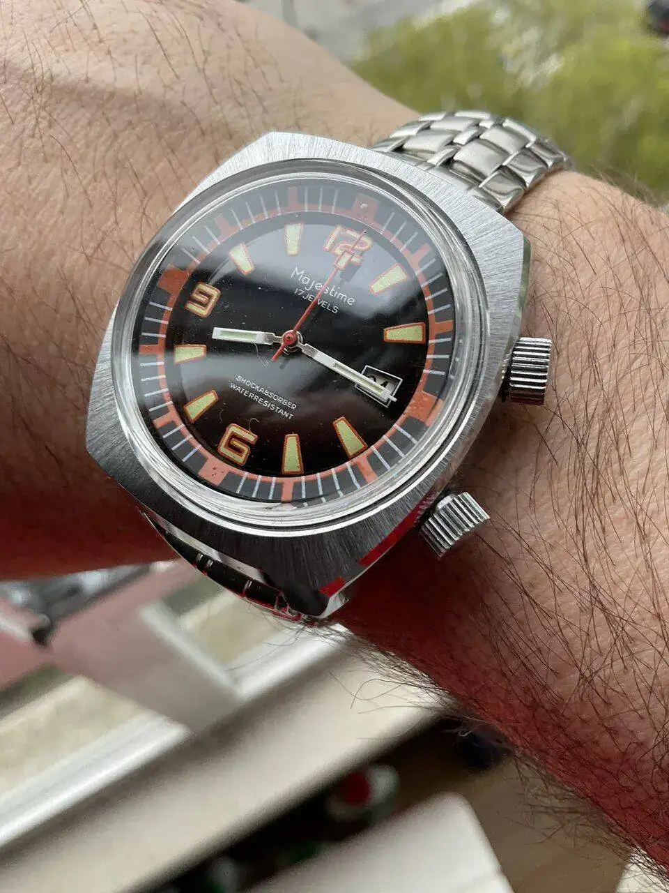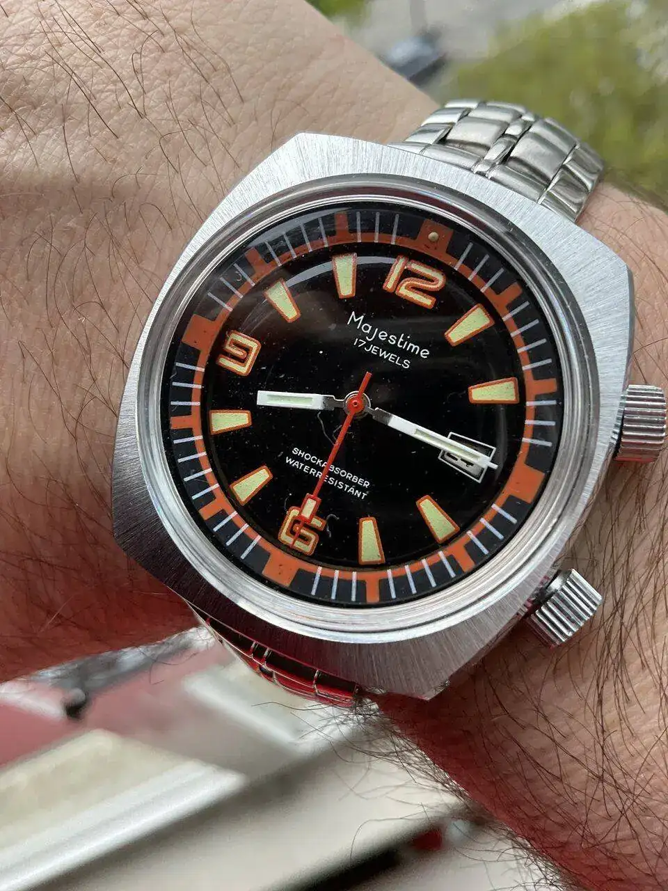 Hoy vintacheando con este aun hoy deslumbrante(ni me imagino en su epoca)Majestime naranjote con doble corona ypara mover su bisel interno