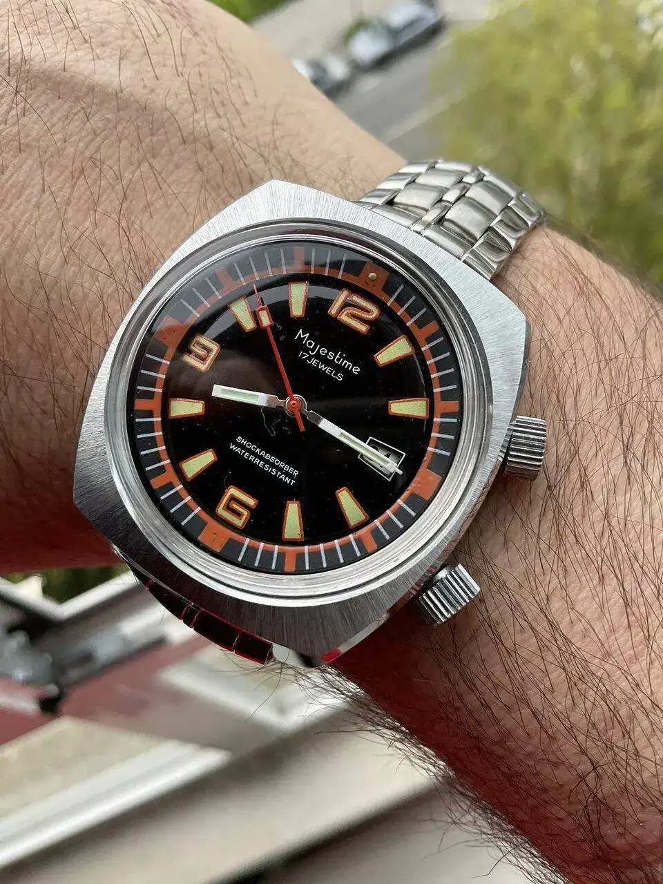 Pues sigue deslumbrando compi. Me gustan bastante, como creo que ya he mencionado alguna vez, este tipo de cajas.Hoy vintacheando con este aun hoy deslumbrante(ni me imagino en su epoca)Majestime naranjote con doble corona ypara mover su bisel interno