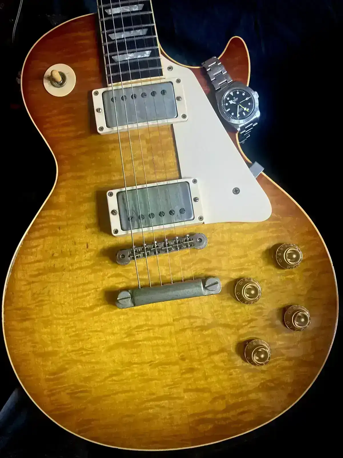 Las Gibson Les Paul son mis favoritas y he tenido unas cuantas pero al final me quedé con la Custom, con una que encargué a un luthier hace veinte años y con la que es mi favorita y número 1 indiscutible (Gibson Les Paul Reissue ‘59 40 aniversario) de la que tengo una foto similar de otro hilo de hace un tiempo: