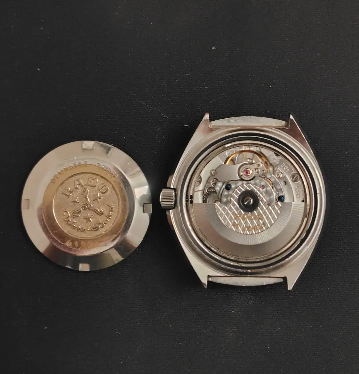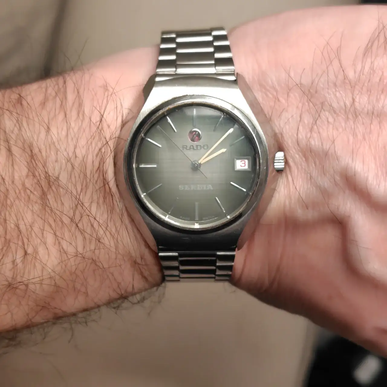 Que bonito y en muy buen estado. Ya.imagino lo bien que te va a quedar. Por cierto para ser un eta 2824 que regulador de volante lleva? Un saludoRecién sacado del buzón. Buenas noticias! El cristal está sorprendentemente bien y no necesitará ser cambiado. Conserva la pegatina protectora original de la parte trasera. El estafó es bueno con pocos rayones superficiales. Necesitará solo un servicio, limpieza a fondo de la caja y cristal y un pulido ligerito en las zonas brillantes. No será necesario tocar el cepillado esta vez. Empezaré el desmontaje la semana que viene. Puede apreciarse neblina en el cristal, que se ve algo turbio, y un pequeño gilpevito arriba en el cristal, pero aparte de eso está en un estado mucho más que aceptable y el ancla de Rado gira muy fluido.