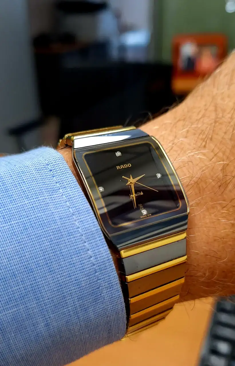 Que ganas de verlo tras el servicio. Compra 🔝Recién sacado del buzón. Buenas noticias! El cristal está sorprendentemente bien y no necesitará ser cambiado. Conserva la pegatina protectora original de la parte trasera. El estado es bueno con pocos rayones superficiales. Necesitará solo un servicio, limpieza a fondo de la caja y cristal y un pulido ligerito en las zonas brillantes. No será necesario tocar el cepillado esta vez. Empezaré el desmontaje la semana que viene. Puede apreciarse neblina en el cristal, que se ve algo turbio, y un pequeño golpecito arriba en el cristal, pero aparte de eso está en un estado mucho más que aceptable y el ancla de Rado gira muy fluido.