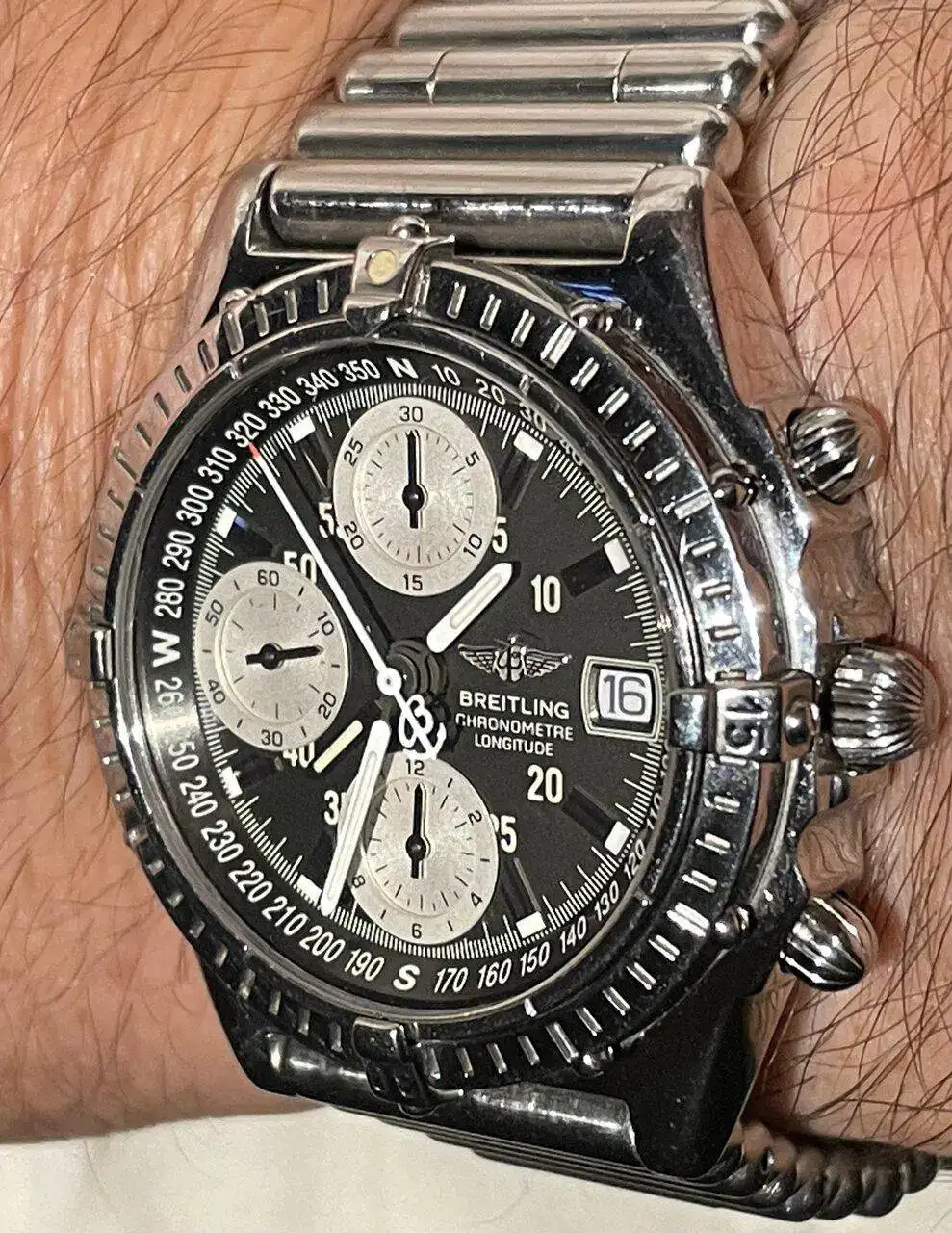 Chronomat Longitude GMT con brazalete tipo bullet de Breitling. Agujas blancas excepto la GMT pulida, que le dan toda la gracia a este vintage, que salió de los buenos en cuanto funcionamiento y precisión a pesar de las décadas. Puede con cualquier correa, que todas le sientan bien. Un clásico atemporal.
