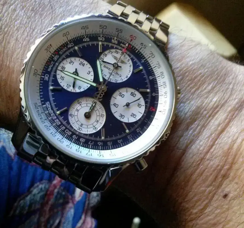 Es un Navitimer Twin Sixty Ed.E. solo se fabricó en el 93. con cuatro marcadores y doble uso del segundero; el 4 marcador de arriba marca la fecha. Juan, el caballo está revolcándose en el verde.Ostras,un Navitimer azul, ahora sí que me da algún jamacuco como al caballito