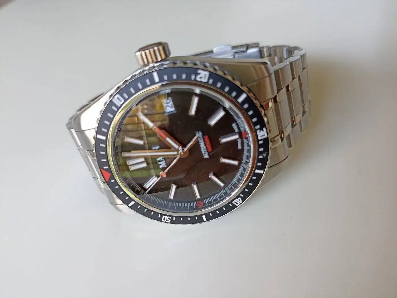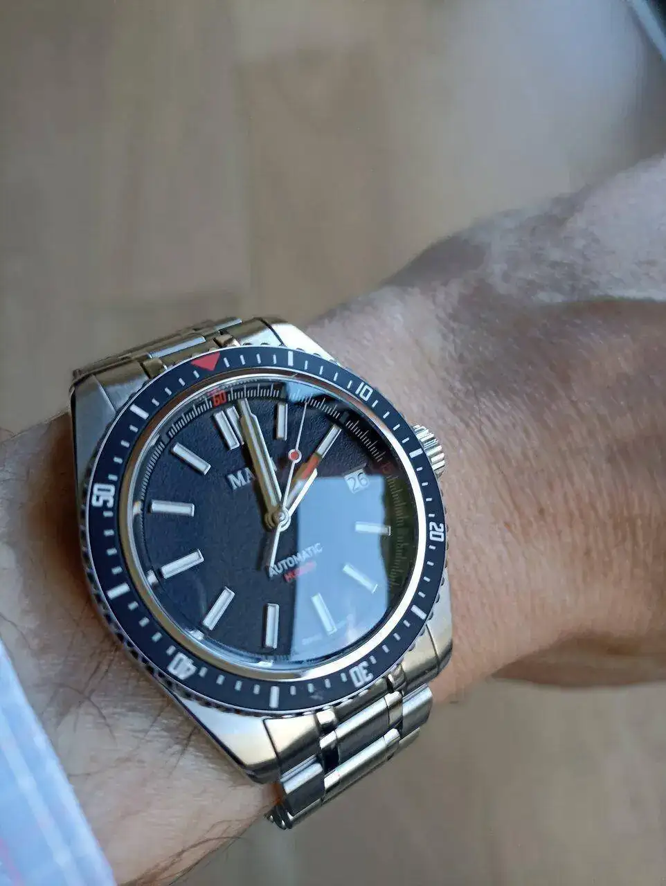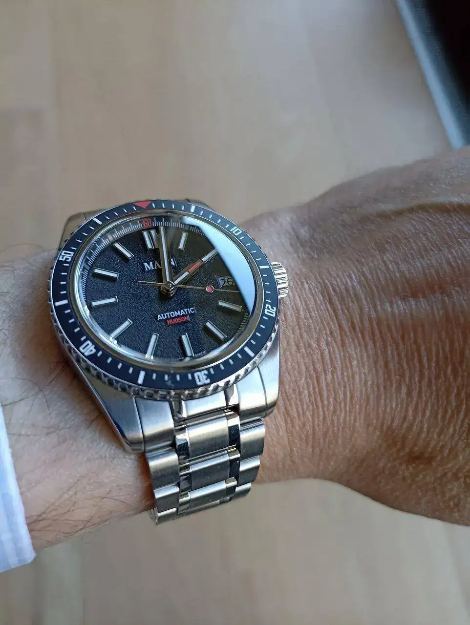 Tengo un par de amigos que están felices con estos Hudson de Maen. Dicen lo mismo que tu compañero, muy buena pieza por el precio. Que lo disfrutesEstrenando. No és un reloj premium, pero tiene unos mecanizados bastante decentes, el ajuste del brazalete en la caja no está mal para su precio y mucho mejor que en otras marcas más conocidas de doble de precio, end links sólidos, y el mecanismo del bisel y corona me ha sorprendido bastante para el precio del conjunto. Una vez puesto me recuerda bastante al bb58, ya que las medidas son bastante similares y el tipo de reloj también, siendo este un 300 metros. Por poner una pega, para mi gusto, haría el cierre más corto. El cierre es mucho mas corto que el de un submariner actual, pero para mi gusto, me gustaria que fuese más corto (por muñeca fina). El calibre es un ronda R150 automàtico, que és un calibre sencillo sin florituras y que viene a +10, cosa que hace años me parecería inconcebible, y que día de hoy me da exactamente igual Veremos si ajusta en unos días. Incluyo unas malas fotos.