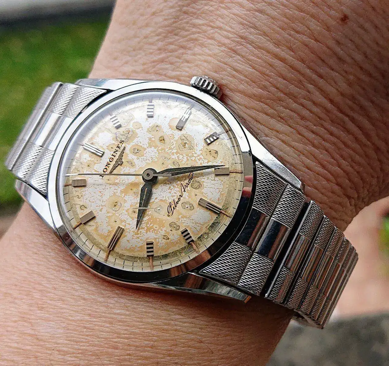 jarrrrlllllHeridas de guerra que lo hacen hermoso, tiene su encanto.¡Buenos días! Una flecha plateada con muuuuchas huellas del paso del tiempo ⚠ Esfera no apta para ojos sensibles
