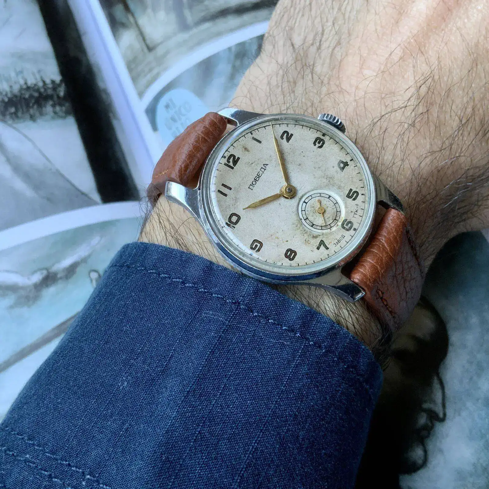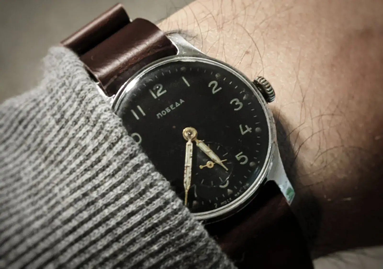 Bonito Pobeda, y unas agujas que destacan mucho sobre esa esfera y que tienen su encanto con esa patina.