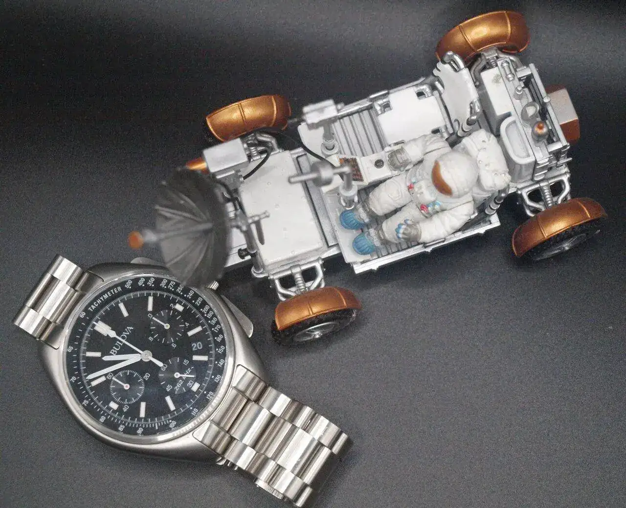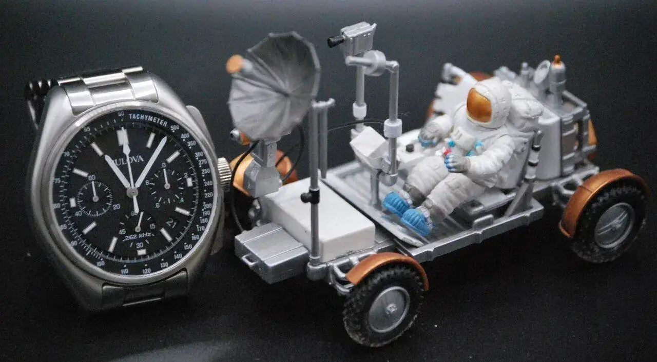 Buenas e interesantes fotos compañero.Muy buenas y feliz sábado de Gloria, hoy nos vamos a la lejana luna en la misión Apolo XV, donde coincidieron el Bulova Moon y el Rover, el reloj volvió a la Tierra, y el Rover sigue allí mal aparcado:
