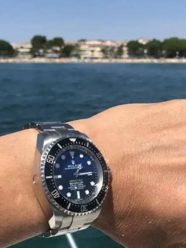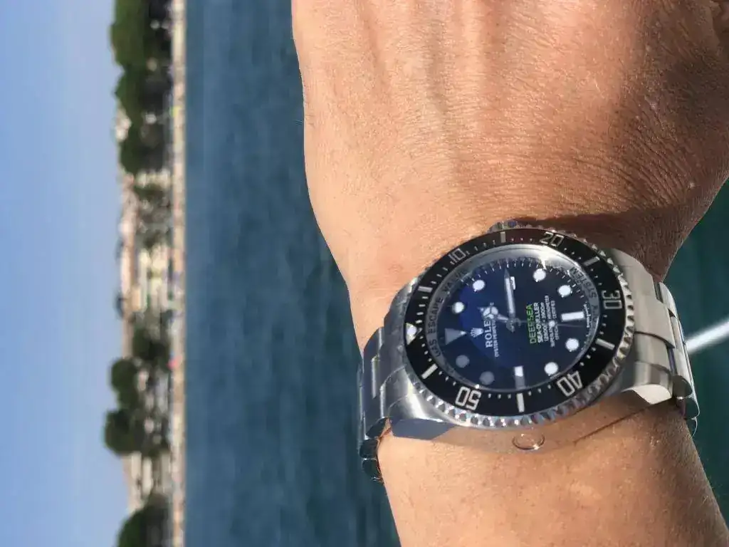 La verdad es que el reloj es de 43-44mm, pero el efecto de la correa nato es que lo levanta bastante de la muñeca, con lo que lo hace un poco cabezón.