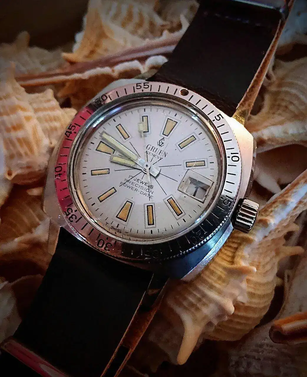 Caja baby pam? Panerai pequeña?? Perdón por mi incultura relojera. Es que lo recuerda entre ese mar de caracolas. Bonita foto y muy chulo el reloj.¡Buenos días! Hoy sale este Gruen en caja Baby Pam