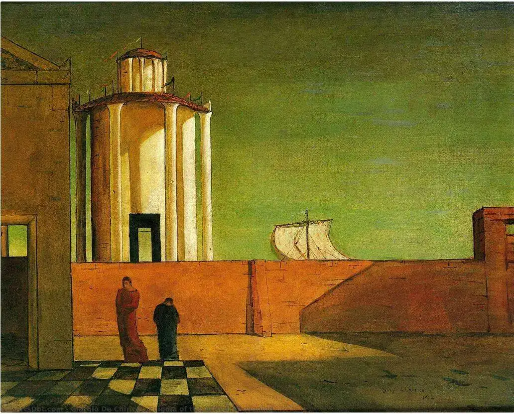 Y aprovechando el mensaje: Giorgio De Chirico, exponente de la pintura metafísica, fue precursor del surrealismo (Dalí, Magritte). El cuadro "Enigma de la llegada de la tarde" (1912) representa una plaza vacía con dos figuras humanas, como en otros cuadros suyos. En esta ocasión un muro divide la percepción mas inmediata de otra mitad más oculta, siempre bajo una atmósfera onírica. En colección privada.