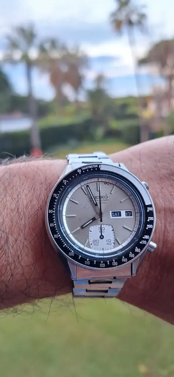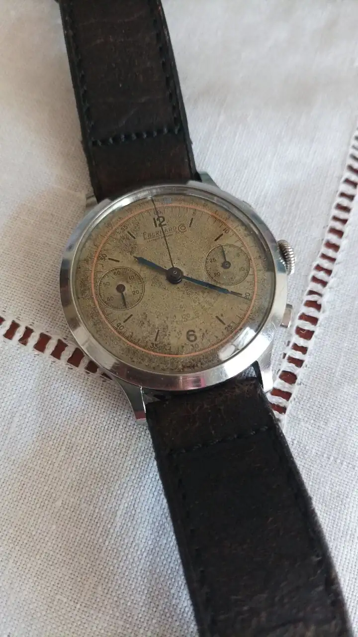 Crono con pátina y seguro que con historia. Precioso.Buen finde foro.
