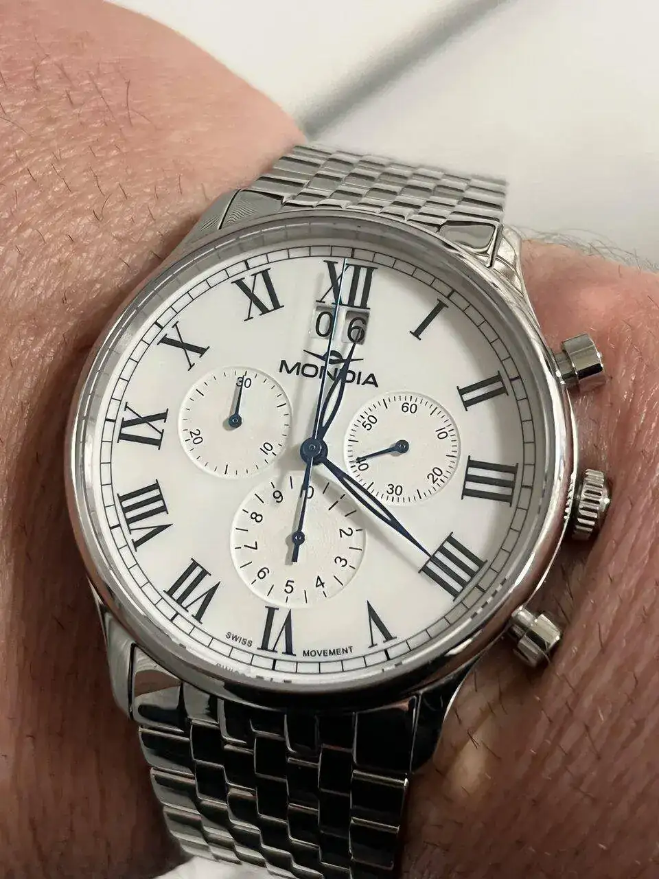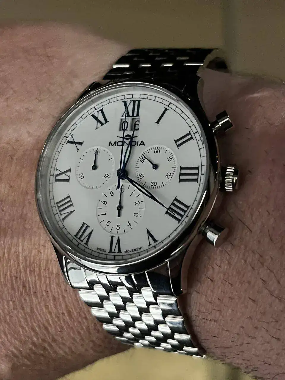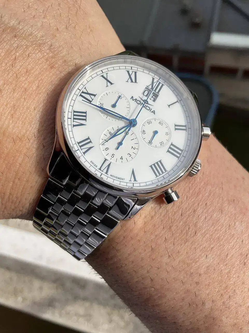 PRECIOSO!!😍Tonight at the Tower,con un marine chrono,40mm de cristal de zafiro,agujas azuladas,gran fecha,maximo clasicismo y legibilidad en una esfera blanca esmaltada.Uno de los pocos clasicos a los que el brazalete cadi integrado le queda oerfecto.Italiano,como no.