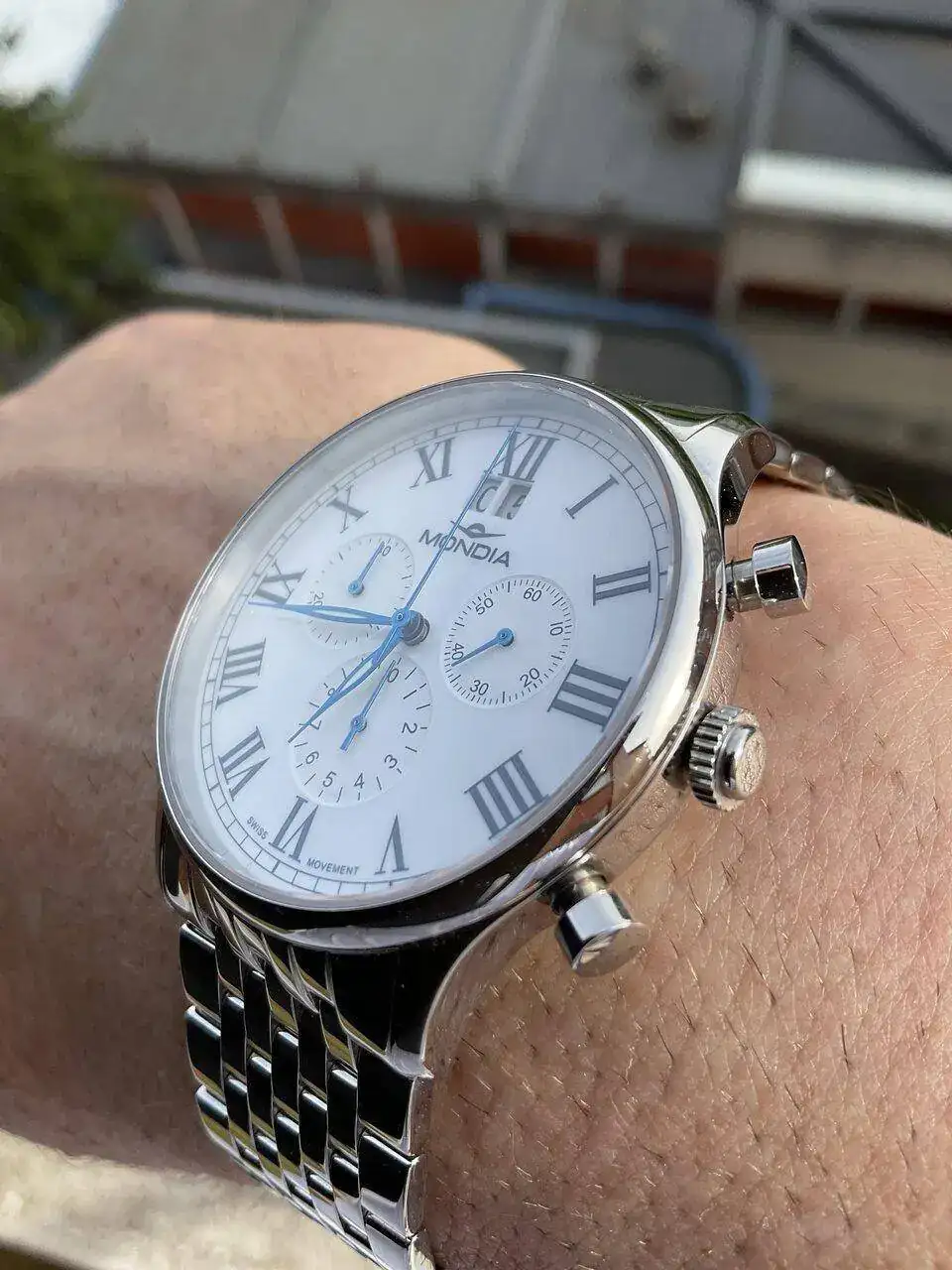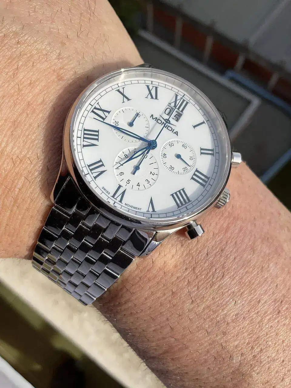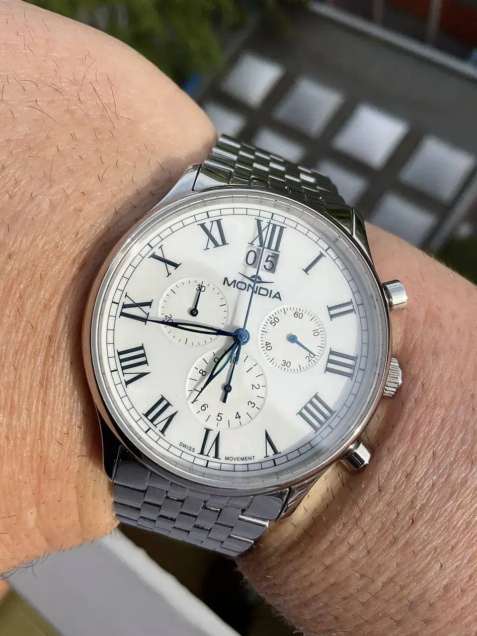 PRECIOSO!!😍Tonight at the Tower,con un marine chrono,40mm de cristal de zafiro,agujas azuladas,gran fecha,maximo clasicismo y legibilidad en una esfera blanca esmaltada.Uno de los pocos clasicos a los que el brazalete cadi integrado le queda oerfecto.Italiano,como no.