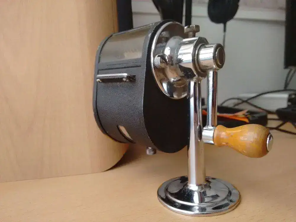 Rebuscando en un armario he encontrado este sacapuntas de mi padre. Hace tiempo que no lo veía por casa y ya lo daba por desaparecido. Por lo que he encontrado en la red, es de la marca "El Casco" que parece estar todavía en activo. Las cuchillas todavía funcionan pero se come los lápices rápidamente. ¿Habrá alguna manera de ajustarlo?