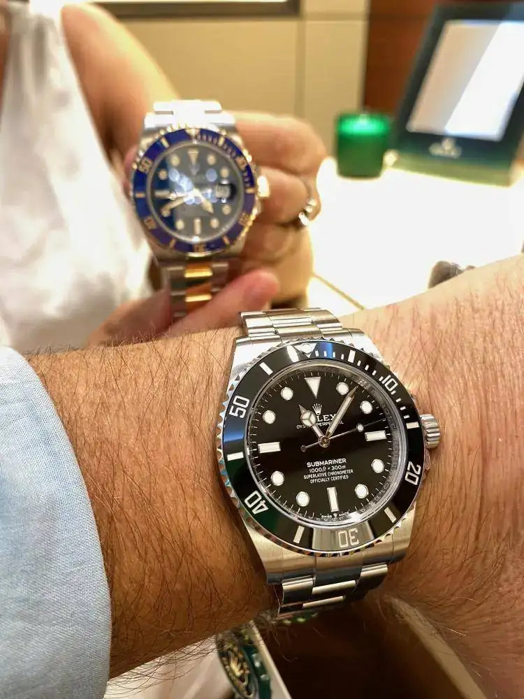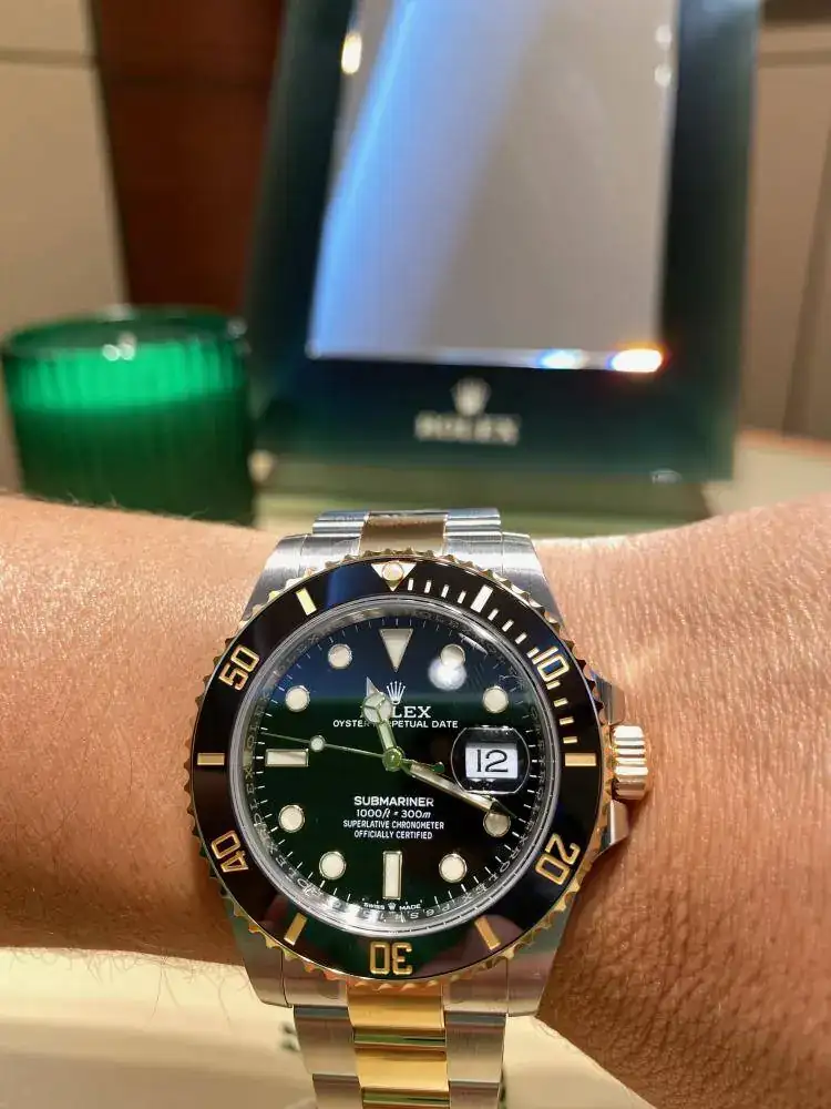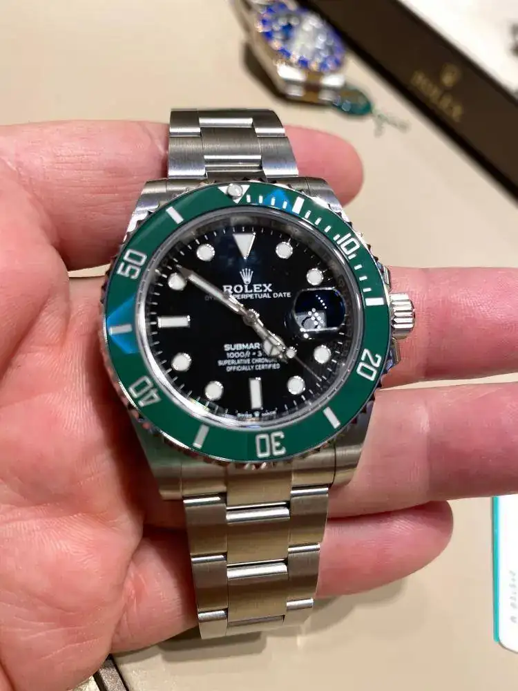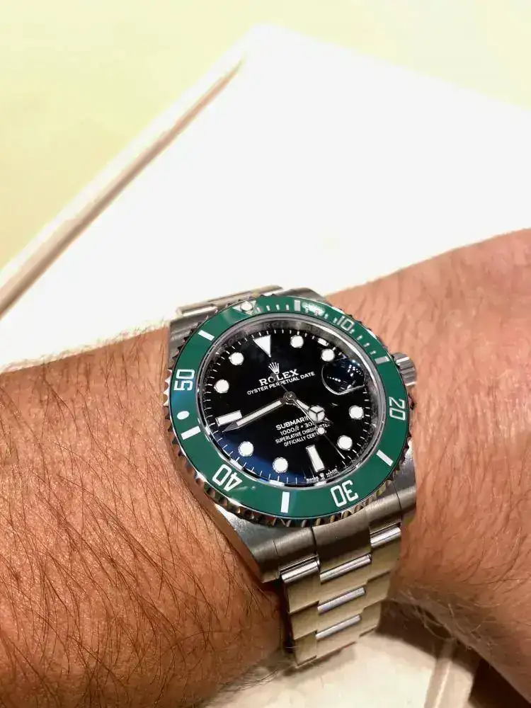 Pues bien, .. Alucinante! el primero en ver fue el 126610LV, "Kermit". A primera vista, se me iban los ojos a la estilización de asas que han calibrado, a la perfecta y preciosa combinación que han realizado con la esfera negra y el bisel verde, a la increíble simbiosis que se crea entre las asas con el end link y armis. Seguido, me lo puse en la mano, cual primerizo se prueba su primer Rolex,.. qué experiencia ehh!! .. Increible lo que han ganado en comodidad. La pieza se encuentra comodísima en la muñeca, principalmente creo que por dos cuestiones: