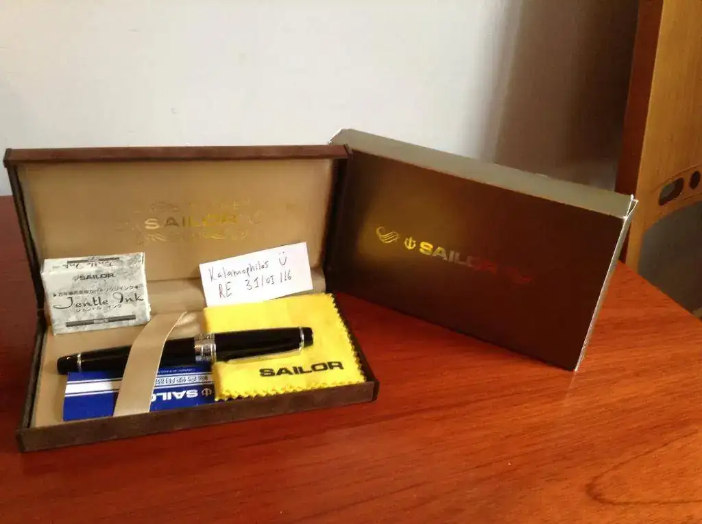 La pluma está en perfectas condiciones. Lleva su convertidor, su caja de cartuchos sin usar, pañuelo de limpieza, estuche de terciopelo marrón y caja exterior de cartón con huellas de almacenamiento en los bordes. Lleva el papelito en japonés que traía por toda documentación.