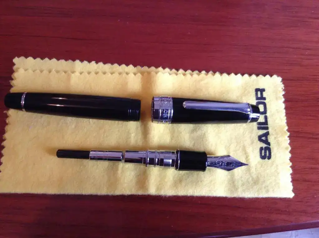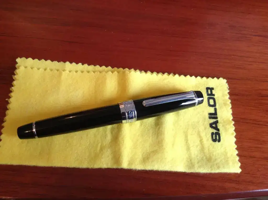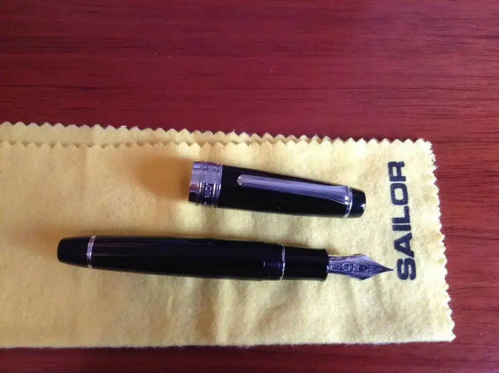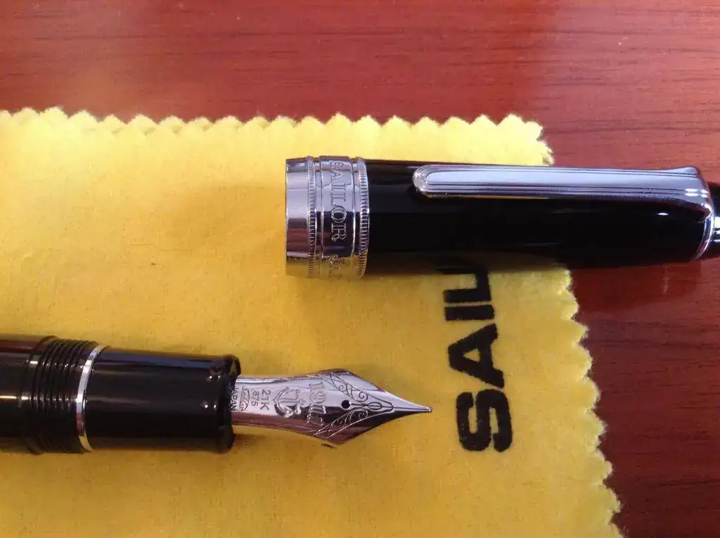 La que pongo a la venta es una King of Pen Pro Gear negra con acabados rodiados. Punto M típicamente Sailor: muy suave pero con la sensación esa de estar tocando papel, el feedback que dicen los americanos.