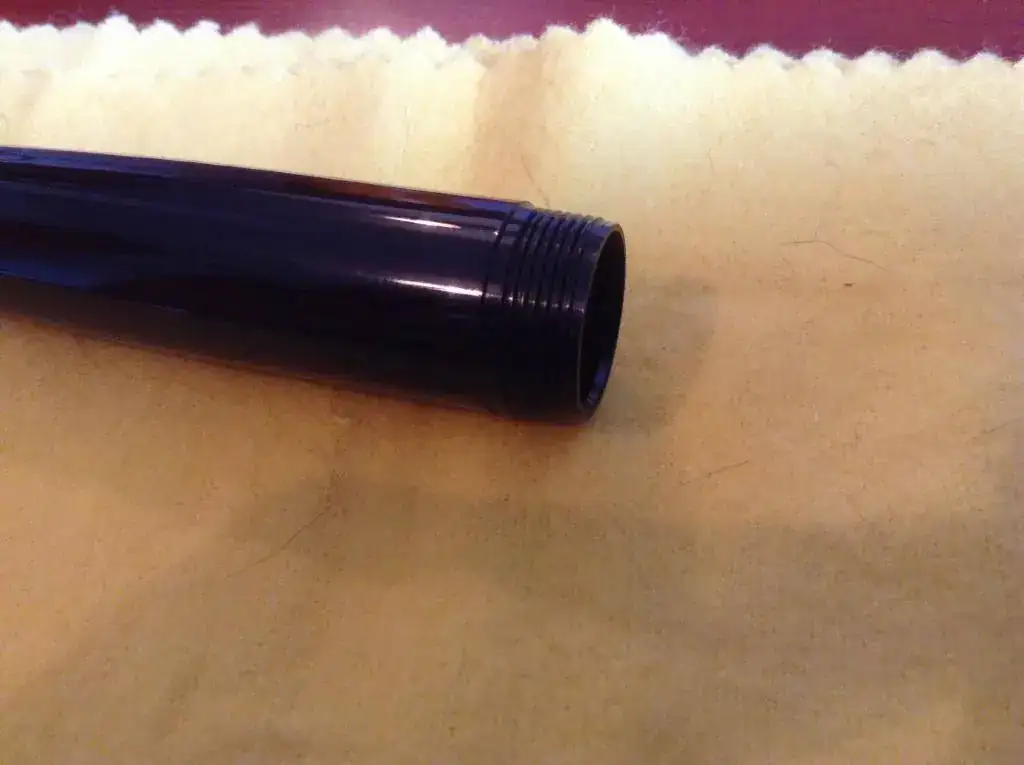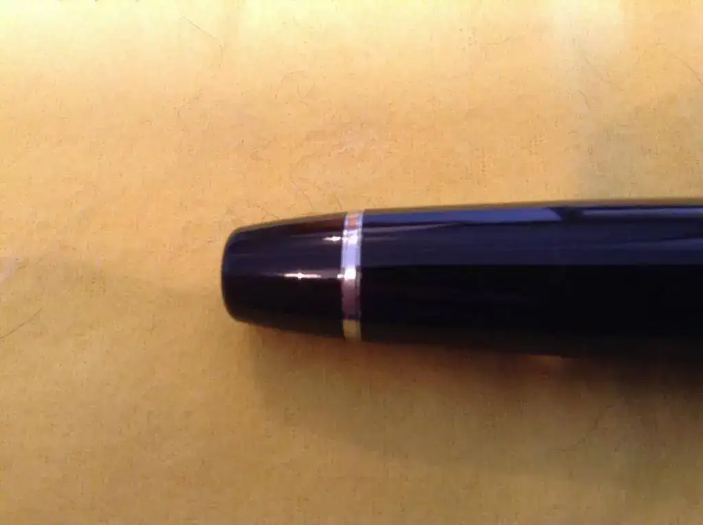 Soy muy puntilloso con mis plumas, así que señalo los dos únicos puntos en los que se nota que la pluma está usada: cierto desgaste en el aro pequeño junto al culote y en la rosca donde se cierra el capuchón. Eso es normal en este modelo y normalmente no se dice. Pero yo refiero decirlo. No logré sacarlo en las fotos, pero mirándola de cerca se ve.