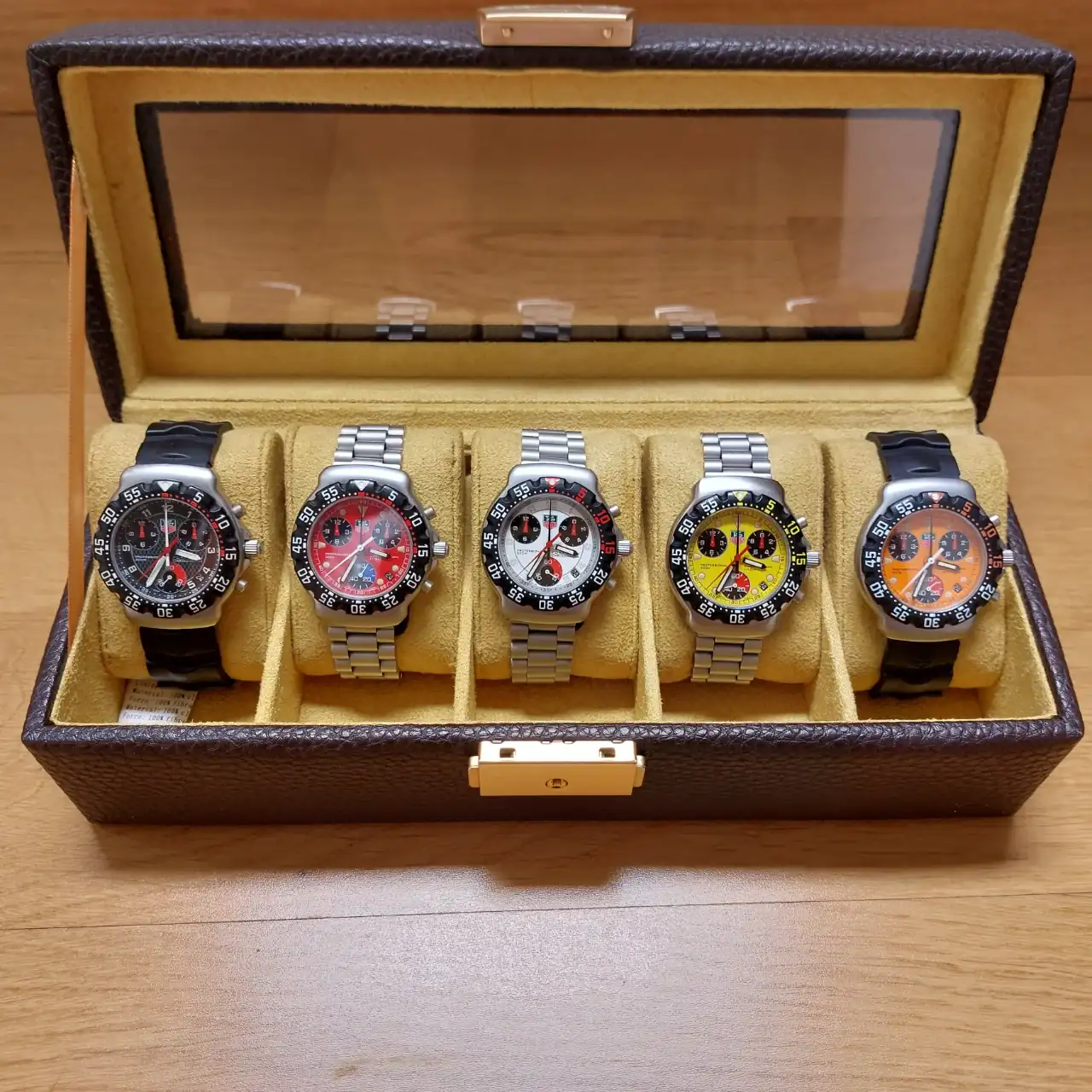 Os cuento para empezar que estoy obsesionado este verano con los TagHeuer formula 1, he vendido algunos de mis relojes (ninguno gran cosa) y estoy haciéndome poco a poco con los Crono de finales de los 90 de los que estoy enamorado. Os mando un adelanto de foto ya que me falta el azulito, buscar brazaletes para todos y reparar algún detallito referente a cajas y biseles (lo más sufrido).