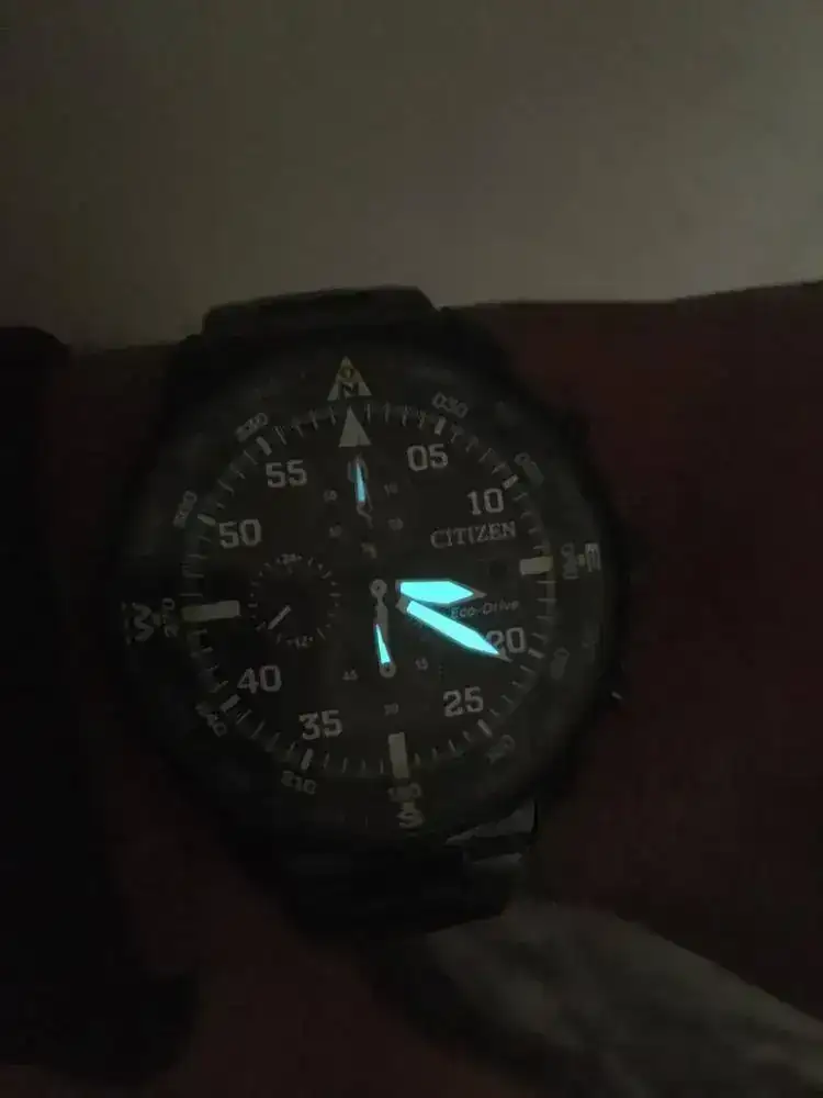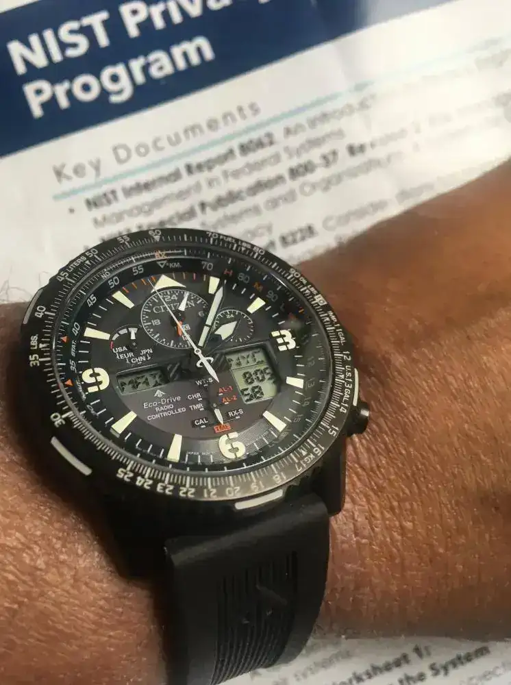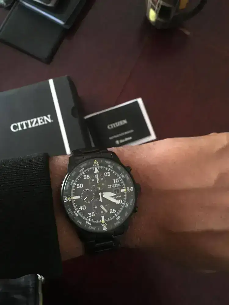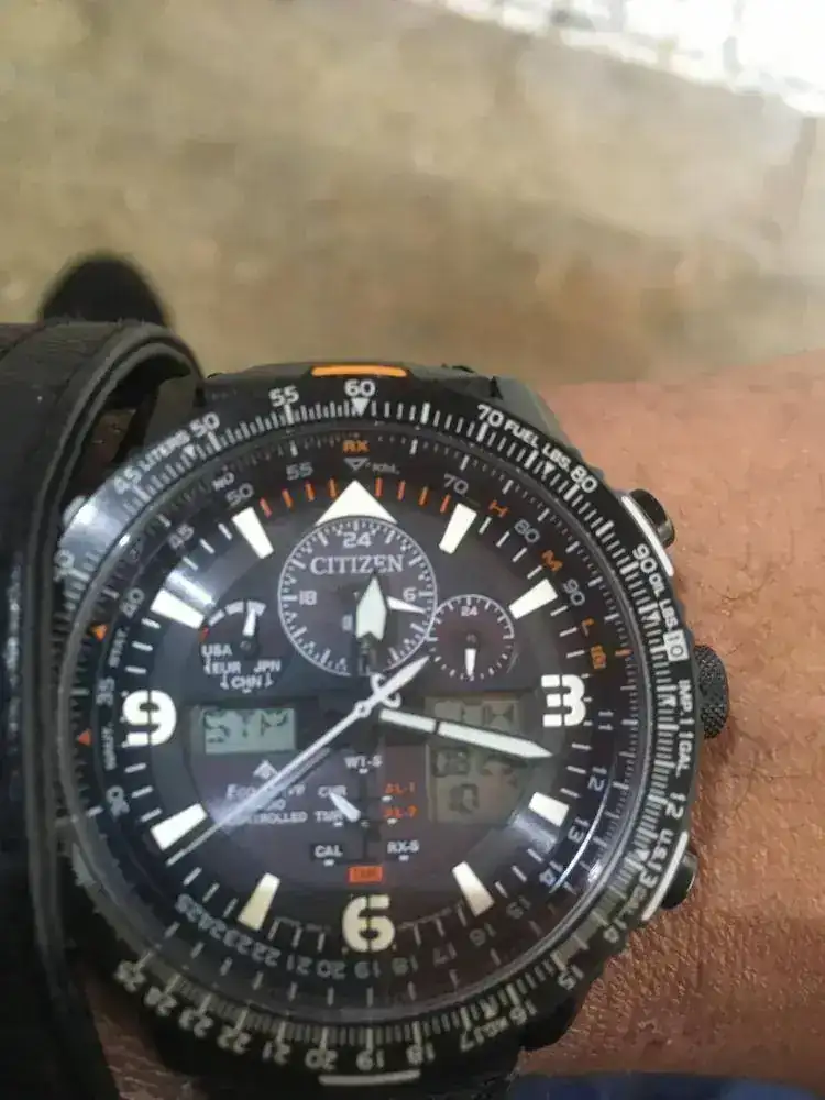 ...Y mi modelo actual de uso diario, el Citizen Skyhawk/SuperPilot JY8085-14H, el cual está modificado con una correa de poliuretano Citizen en lugar de la de cuero. Estaba pensando en un Breitling B50 Cockpit pero el precio se va de madre y el Citizen con Ecodrive y siendo Radio-Controlado le da mil vueltas, es "best bang for your buck" por eso un montón de pilotos militares en EEUU y en otros países lo emplean a diario como "tool-watch".