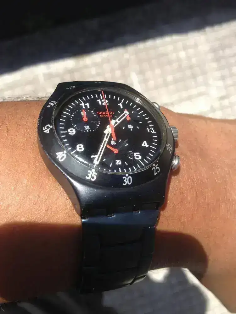 Después de aquello me fuí al Corte Inglés plara ver relojes que no me fundieran la cartera. Vi este reloj cronógrafo suizo Swatch con movimiento ETA y me encantó. Era el Swatch YCB4008-AG "Black n' Red":