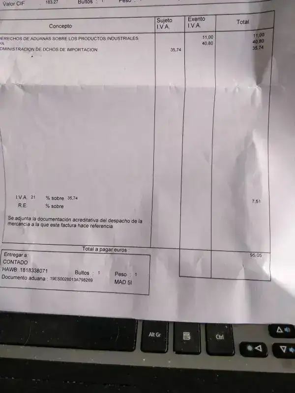 O sea que realmente estamos hablando de 45,74€ de gastos de aduana, un 28,36% del valor declarado. Eso si me cuadra.