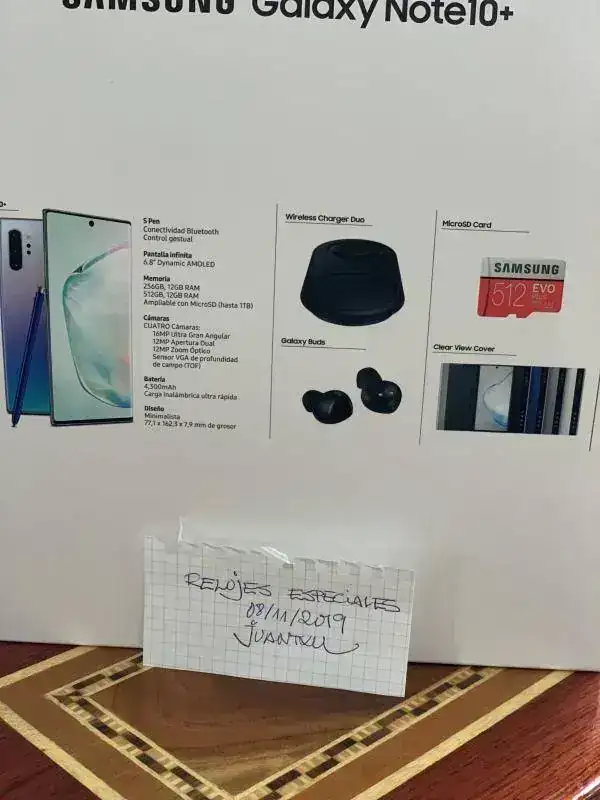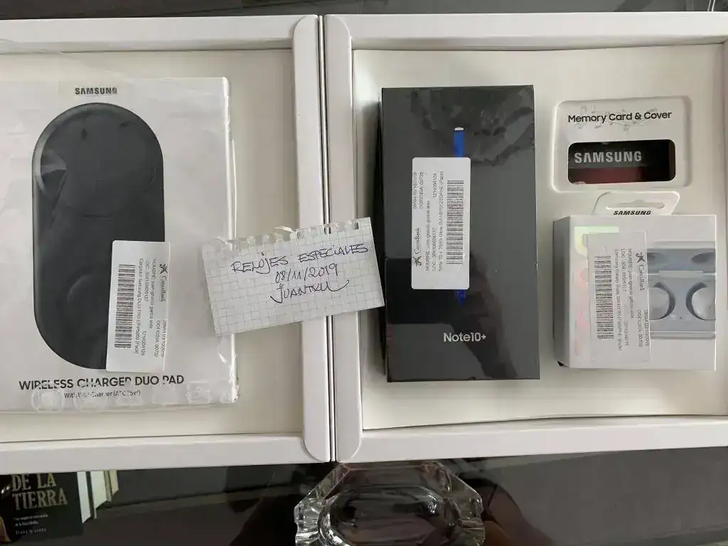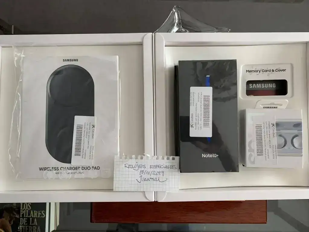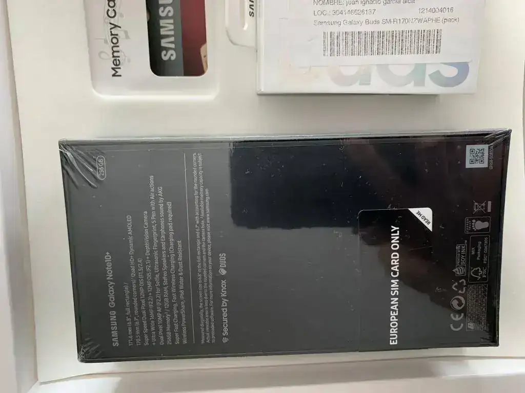 Procedente de compra bancaria hace una semana, vendo Samsung Galaxy Note 10 + con 256 GB de capacidad , recibido hoy mismo en un pack especial que incluye el celular en su caja y accesorios incluidos ( auriculares y cargador ) , otro cargador Samsung inalámbrico , una funda específica para este modelo, una tarjeta de memoria de 512 GB y unos auriculares Samsung inalámbricos , todo ello valorado en 1.450,-€ PVP, según acreditó con factura , dos años de garantía oficial, todo ello a estrenar por supuesto, precio establecido 1.300.- € gastos de envío incluidos.