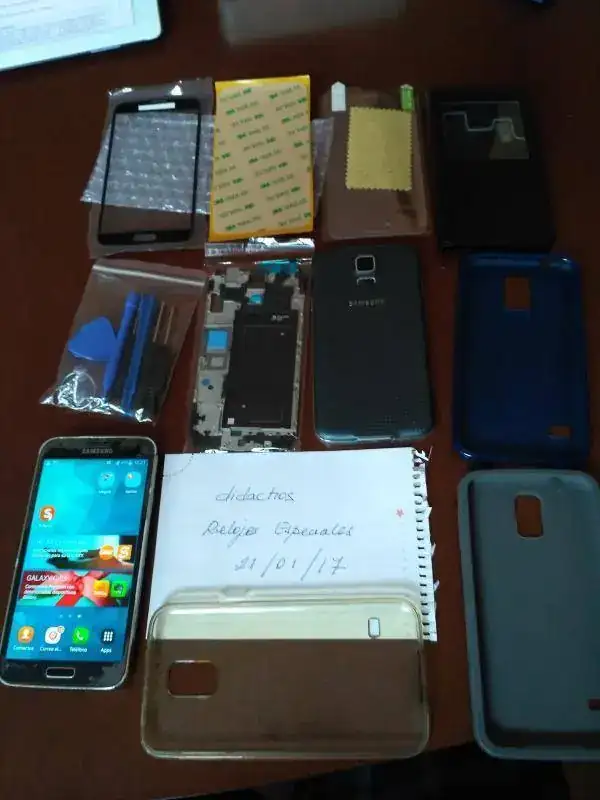 Se vende Samsung Galaxy S5, color negro, el teléfono está muy muy currado pero funciona perfectamente. Hace un par de días recibí un set de piezas para reponer las deterioradas y dejarlo impecable que se adjuntan al móvil (tapa trasera, marco color aluminio, táctil, etc) . Una de ellas es el táctil que está bastante mal pero que actúa perfectamente ya que la pantalla OLED no está tocada.