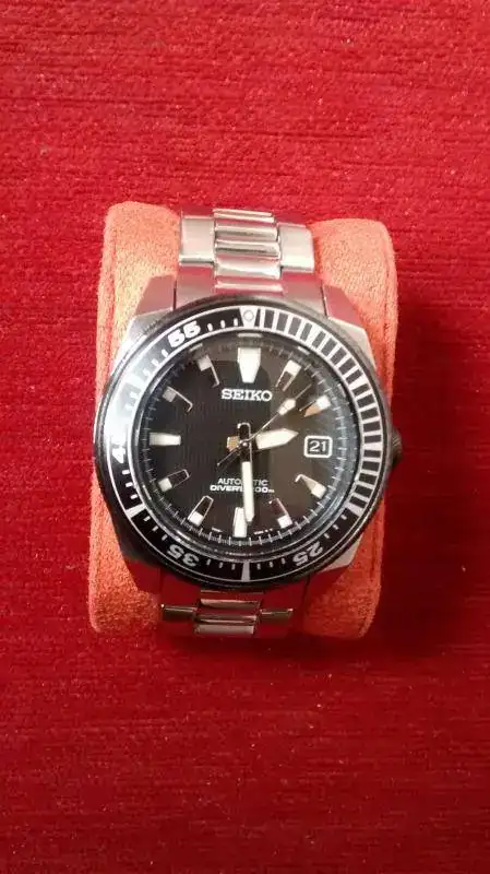 Otro mas que sale porque ya no uso, en esta ocasión un Seiko Samurai, de acero y con dial en negro. El reloj según pude averiguar por su nº de serie es del 2006, yo lo compre usado en el foro hace unos 4 años mas o menos y lo he llevado bastante, se ve usado, no maltratado, pero si usado, si buscas un reloj nuevo o de reestreno, este NO es tu reloj. El insert tiene algún toque, las asas tienen los arañazos típicos de cambios de correa y en general señales de un uso normal, no golpes ni maltrato, pero si con un uso normal, el brazalate que lleva puesto es yo creo que lo que peor está, muchas marcas en el cierre de rozar con la mesa y además no tengo de el eslabones sobrantes. Cuando lo compre se le comprobó la estanqueidad, pero ha pasado mucho tiempo así que no puedo garantizarla, si lo vas a mojar tendrás que hacérsela otra vez.