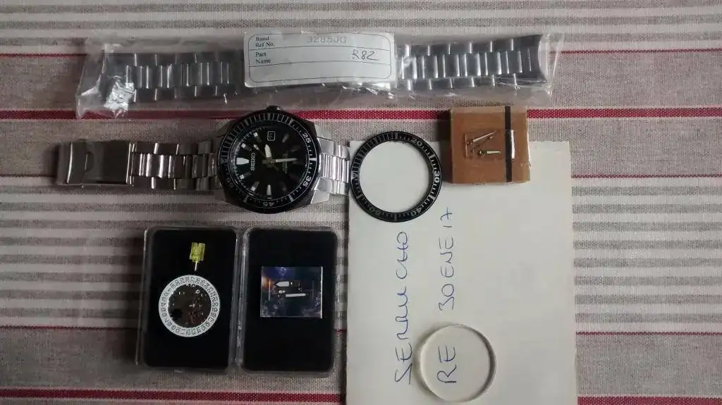 ). El insert como ya dije tiene sus pequeños rozes así que añado uno nuevo para que se lo cambies cuando quieras, es el del modelo de titanio que ha sido el único que he podido conseguir, y por último y no menos importante, también añado al lote un movimiento NUEVO y original Seiko 7s35, por si acaso.Con todo esto, y un ligero pulidito, tienes Samurai funcionando para tus nietos y si sumamos el precio de cada cosa por separado ....