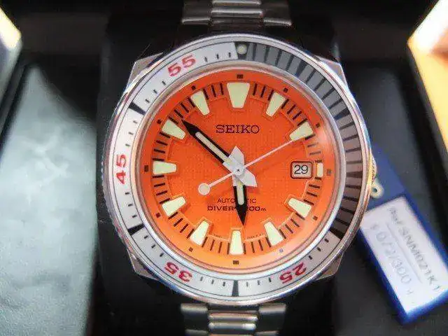 Tiene cristal de zafiro, esfera naranja texturizada, movinmiento automatico 7s35 de 23 rubies, corona a rosca caja de 43mm grosor 14mm sumergible 200mts.