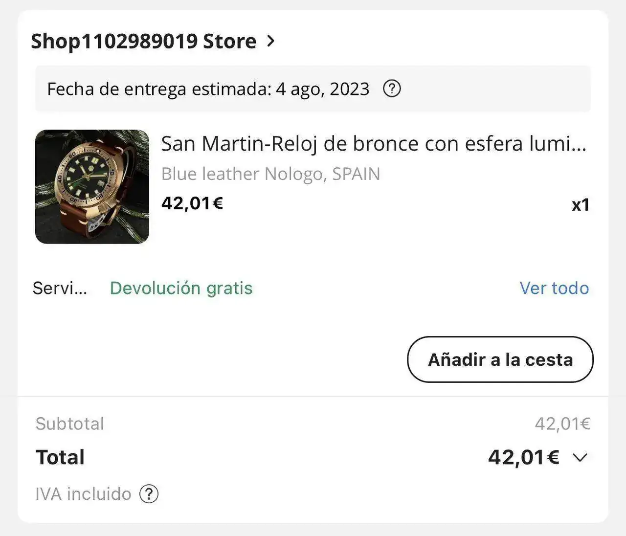 Hoy buceando por Aliexpres veo que sale un precioso San Martín con caja de bronce y modelo tortuga a 42’01 , entonces hago como si lo fuera a comprar y sale el mismo precio, a 42’01 y visto esto lo compré. Pero este precio no es el suyo , es un reloj muchísimo más caro. Ya tengo el correo que me confirma el precio que he pagado, aquí os lo adjunto, he recortado la foto para que no salgan mis datos :