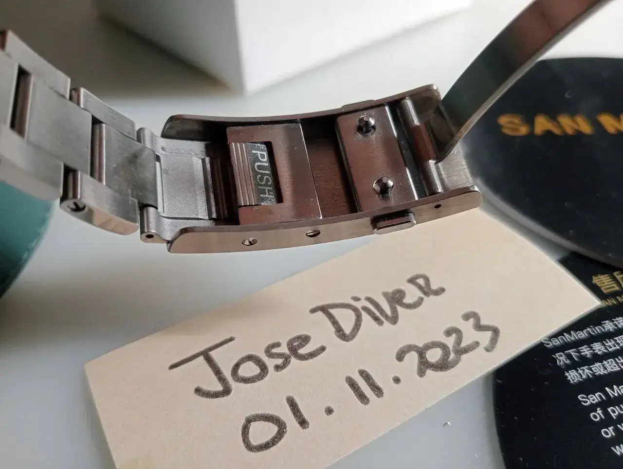 Titanio grado 5 en todo el reloj, excepto tapa trasera y cierre, que es titanio grado 2. Aspecto casi de acero, ya que lleva un baño de platino según fabricante.