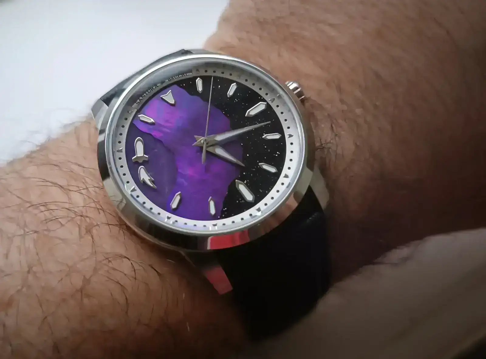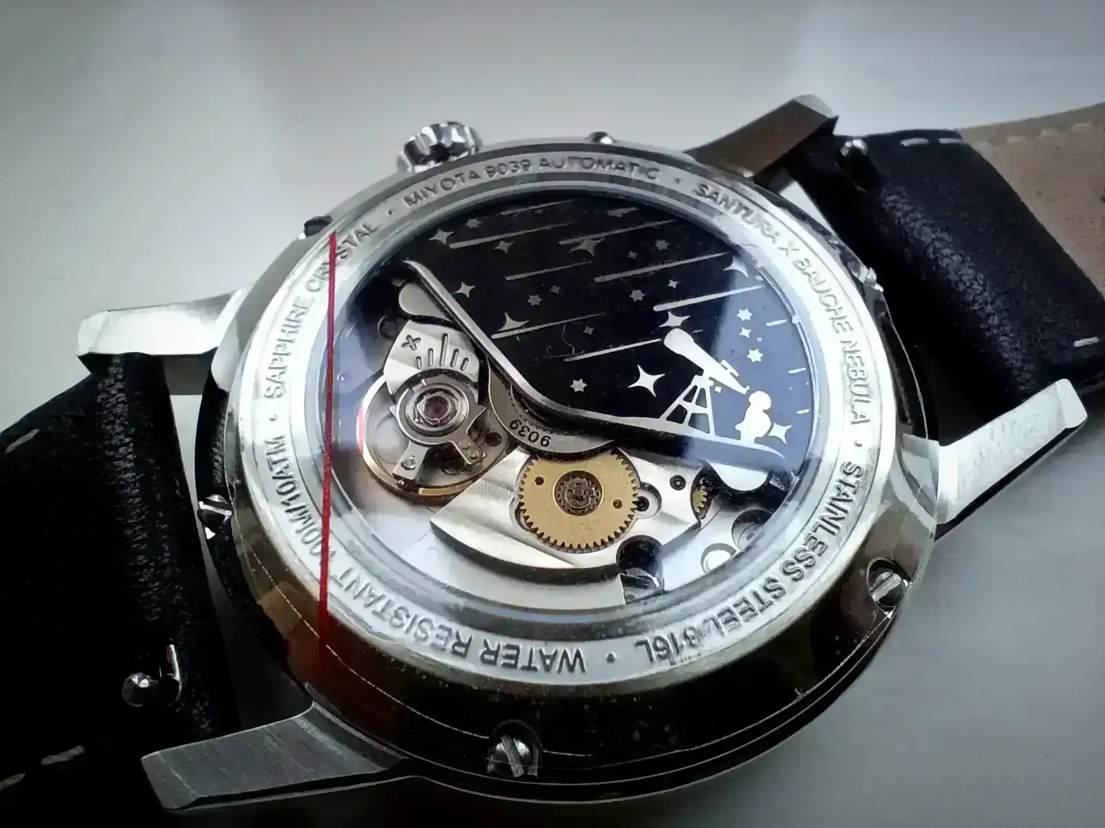 El diseño de la esfera está compuesto por tres partes a cual más maravillosa: aventurine, madre perla y piedra natural. El mecanismo que dá vida al reloj no podría ser mejor para relojes por debajo de los 1.000 euros, un Miyota 9039. Cristal de zafiro, un bonito grabado de la tapa y corona roscada.