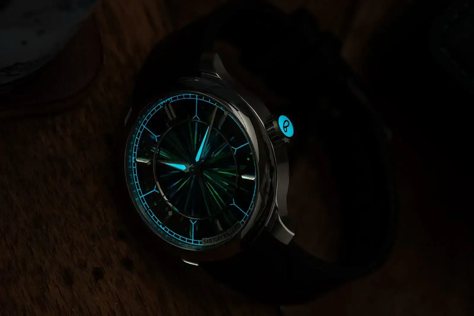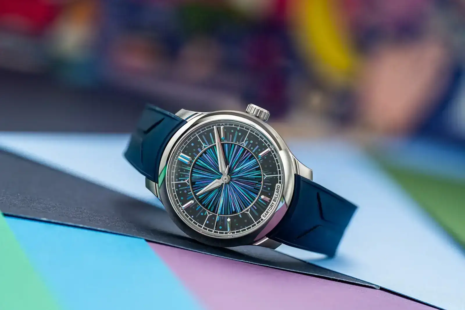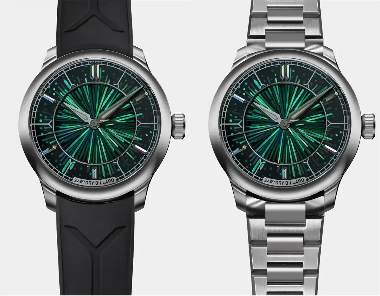 El resultado es un lienzo iridiscente con vibrantes tonos verdes, violetas y azules: una caótica explosión de luz única para cada reloj e imposible de reproducir.