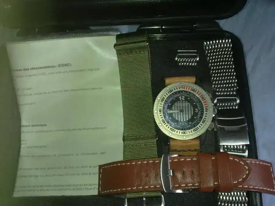 Se entrega con certificado/documentación COSC original y caja tipo Pelican,se envia con cuatro correas,dos de cuero artesanal,una nato mas una tipo omega que para mi es la que mejor le queda