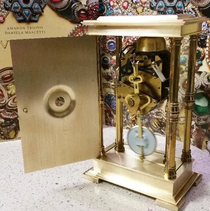 Movimiento a la vista de la caja cristalera, donde podrá contemplar el buen funcionamiento de la pieza. Todas sus partes, llaves, mecanismos, péndulo y accesorios están perfectamente puestos a punto y en estado impoluto.