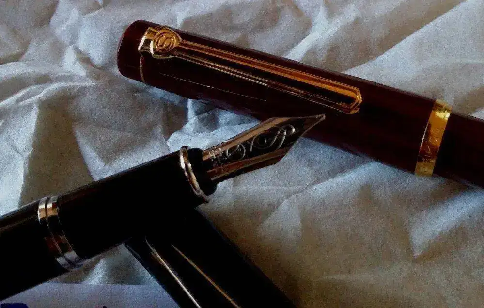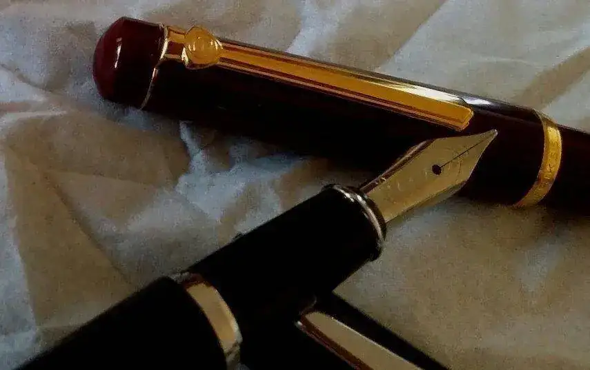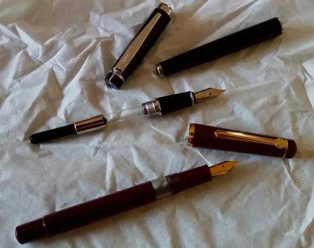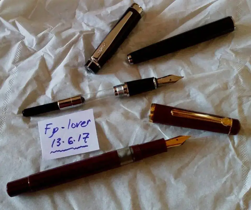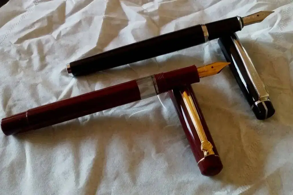 la mas antigua es de color burdeos, carga tinta a embolo, los terminales Y el plumin con un baño de oro, el plumin tiene un punto F (tirando a M)