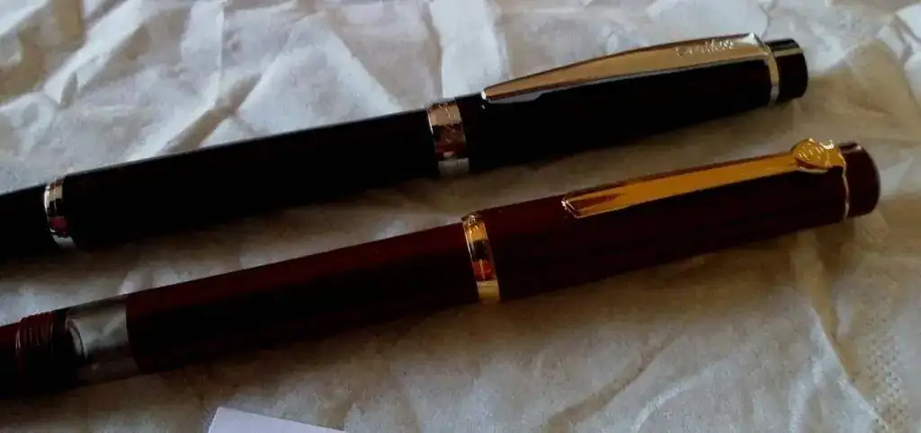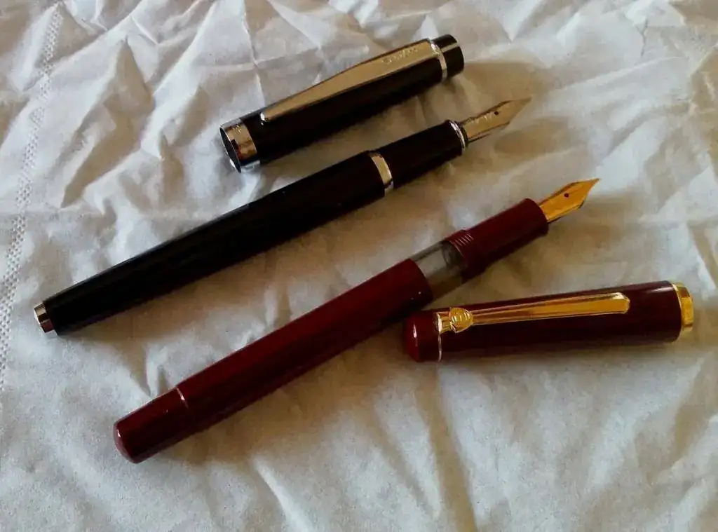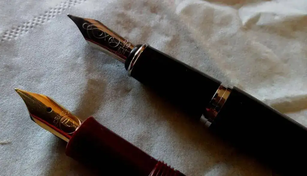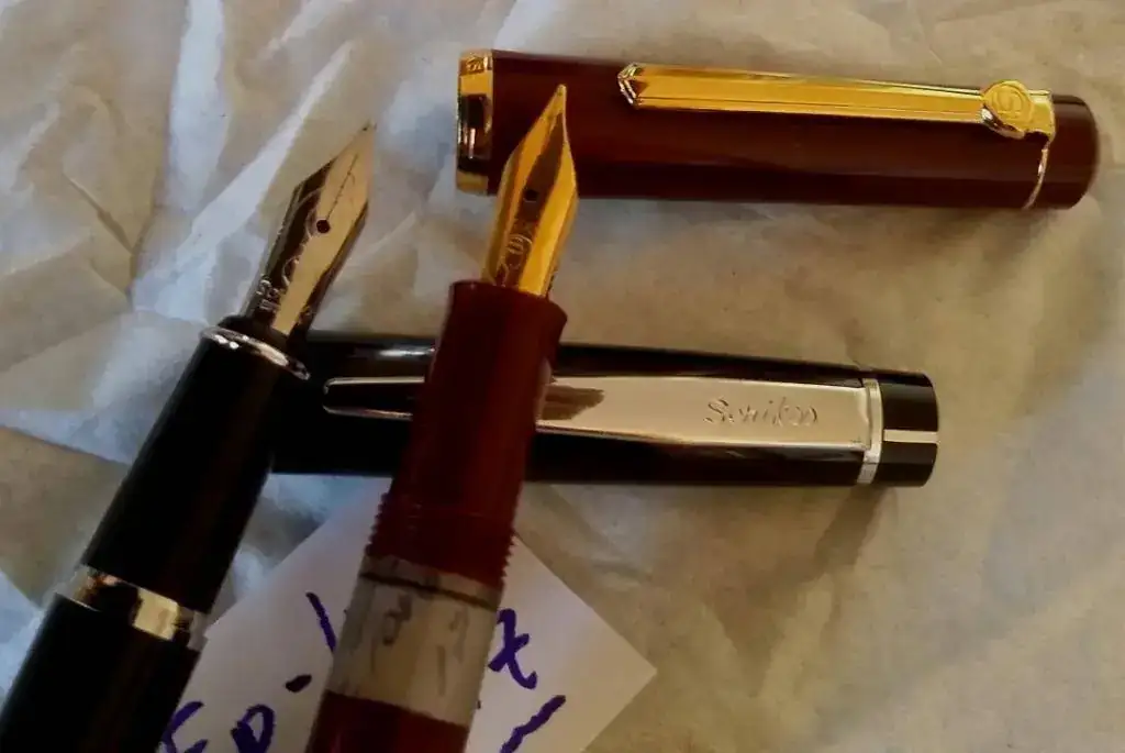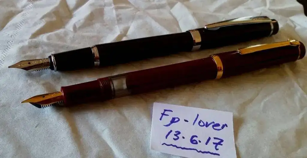 la mas antigua es de color burdeos, carga tinta a embolo, los terminales Y el plumin con un baño de oro, el plumin tiene un punto F (tirando a M)