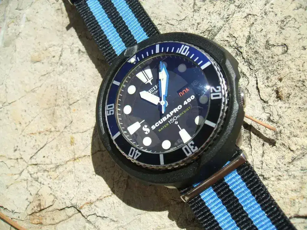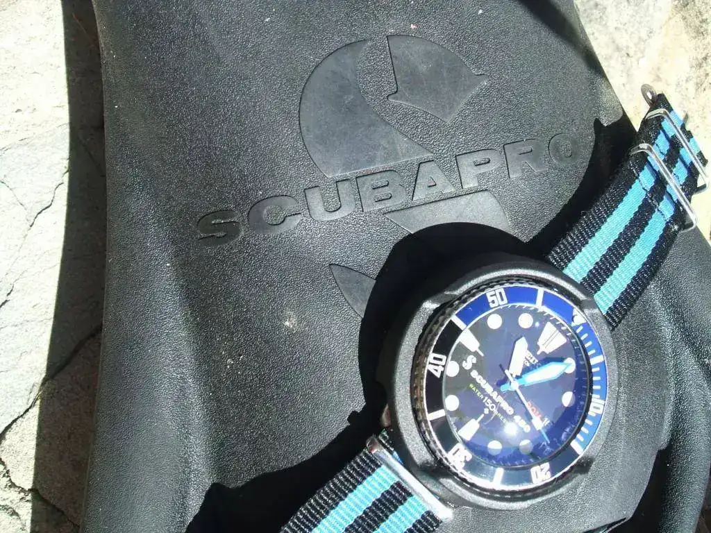 Me regalaron este que estaba roto, rayado y sucio lo lleve as SAT que me arreglo el movimiento, luego en eBay compré un dial Scubapro 450, unas manecillas del tipo "plongeur", un cristal zafiro abombado mod. "double dome" un bisel "batman", un protector de caja de plástico al estilo tuna de la web -dragonshroud- y una correa nato con los mismos colores que las correas que llevan las bombonas de buceo de la marca Scubapro, y este fue el resultado.