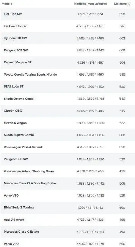 Una tablita que he encontrado con algunos rancheras en base a medidas y volumen maletero: