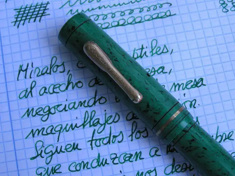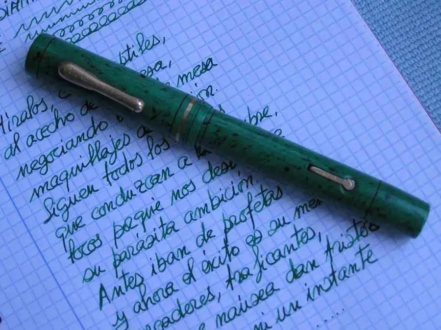 Es una pluma que ha conservado muy bien su color original con el paso del tiempo. Se ve que los plásticos de color Verde Jade de Conklin eran mas estables y mejores que los de Sheaffer o Parker.